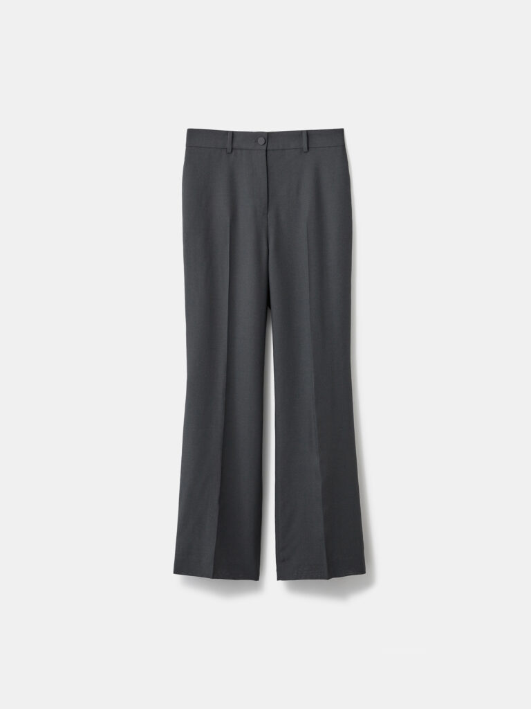 「ウールブレンドストレートパンツ」はセンタープレスが縦ラインを強調し、すっきりとしたシャープなデザインが印象的なセミワイドストレートのパンツです。裾に掛けて緩やかに広がるフレアシルエットが足を長く見せてくれます。ステッチを目立たせない縫製にこだわり、ミニマルに仕上げています。