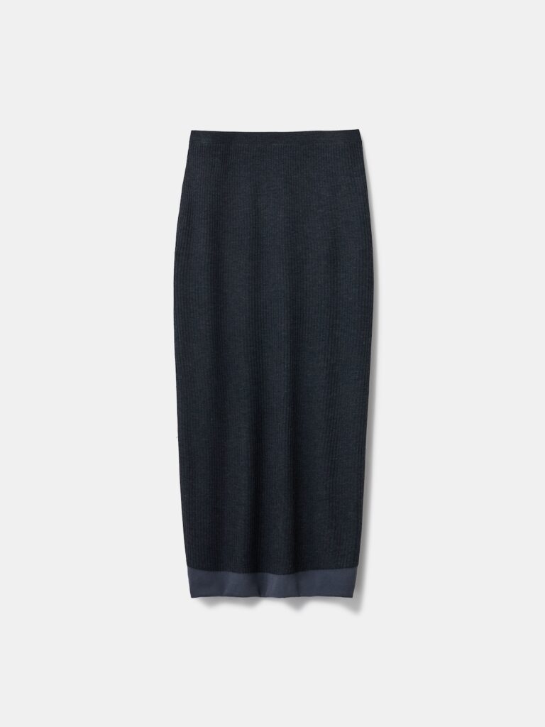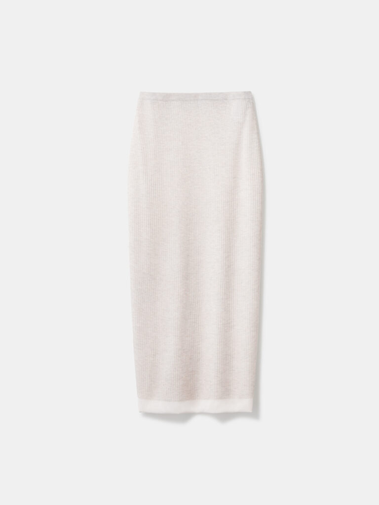 リブ編みのラインで縦長の印象をつくる「シアーリブニットスカート」。内側の天竺編みと表面のリブ編みを繋げて編むことで、自然と内側の素材が噴き出すように計算されています。女性らしさのあるタイトなアイラインシルエットです。