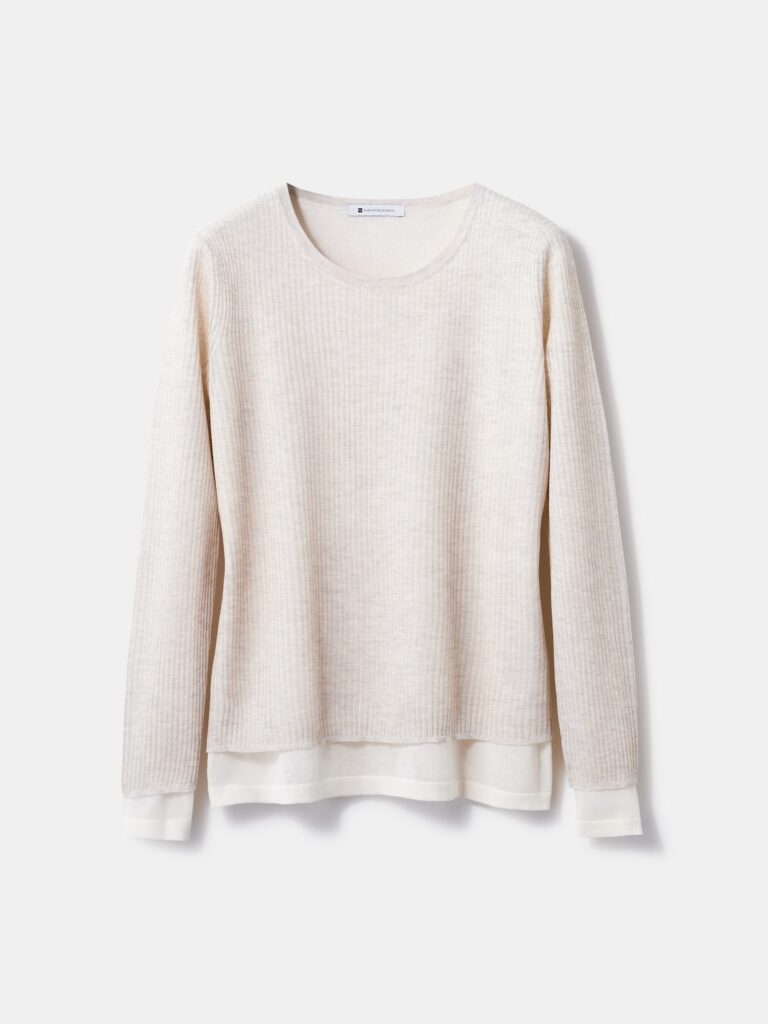 上品で華奢な素材選びにこだわった「Sheer knit」は薄手で華奢な光沢糸の入ったシアー感のあるリブ編みと、フラットな天竺編みを重ね合わせたシリーズです。リブの畝と内側の色や素材感が織りなす独特な表情が魅力。内側の素材が袖口や裾から噴き出してくるようなイメージでシルエットを構築しています。