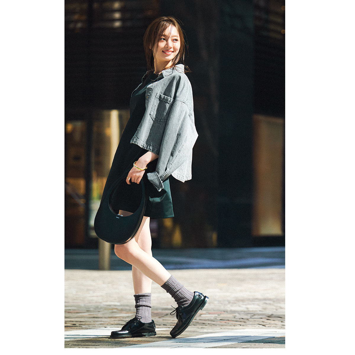 ミニ丈の黒ワンピは、足元にボリューム感のあるソックス×ローファーを合わせて甘さを引き算。グレーのGジャンをさらっと羽織ればヘルシーで今っぽいムードに決まります。“気取りすぎずちゃんとオシャレ見え” な装いで、好印象をゲット。