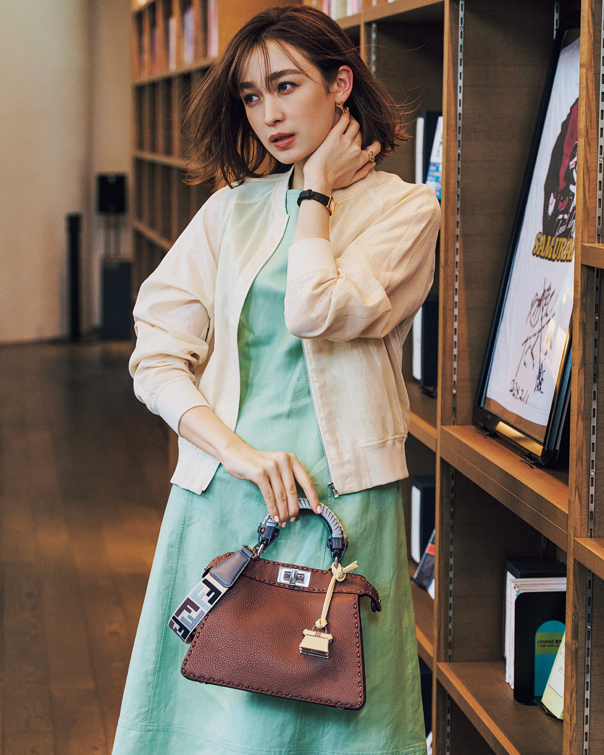 清涼感のあるグリーンワンピは、羽織りでカジュアルさを足すのが正解。ブルゾンの軽やかさがこなれ感を引き出しつつ、バッグで上質な空気感をプラスしてバランスよく。キレイめだけどかしこまりすぎない、休日デートにぴったりな着こなしに。