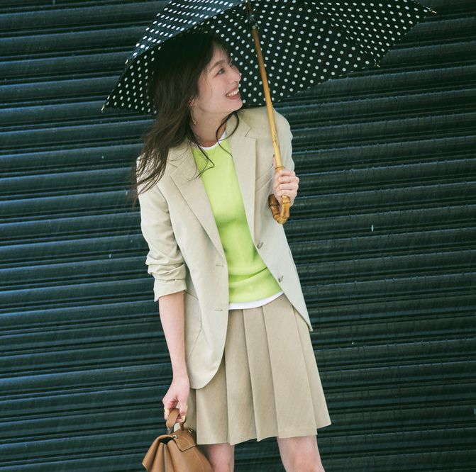 ギンガムチェック柄とバンブーハンドルのバランスが◎。雨傘としてはもちろん、UVカット加工が施されているので日傘としても使える晴雨兼用モデルです。傘はトラディショナル ウェザーウェア、ジャケットはユニクロ、ニットはミラ オーウェンのもの。