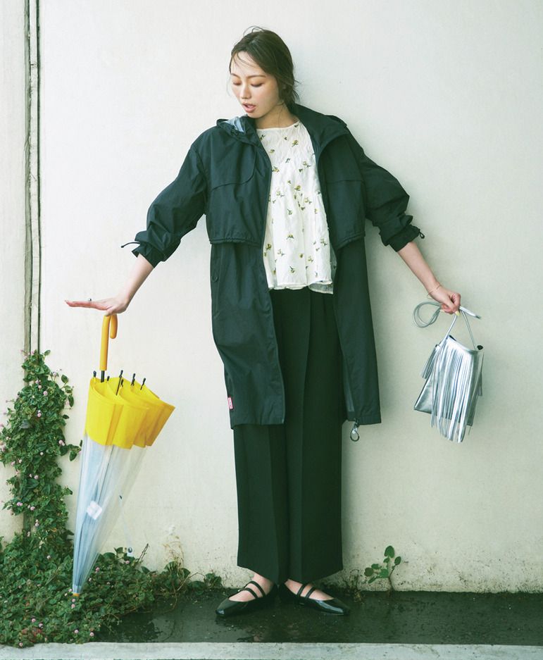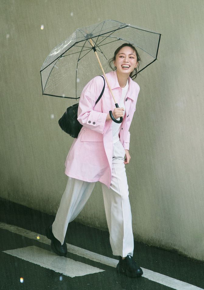傘の老舗ホワイトローズ社のサードマガジン別注デザイン。宮内庁御用達でもあるホワイトローズ社の傘は、いわゆるビニール傘とは一線を画す耐久性と品格を持ち合わせた造りが魅力です。ベージュのパイピングと木の持ち手で、フェミニンなビニール傘。傘はサードマガジン×ホワイトローズ、レインブーツはマッキントッシュ、アウターはHER.、ショートパンツはティーチ、Tシャツはロエフ、バッグはステート オブ エスケープのもの。