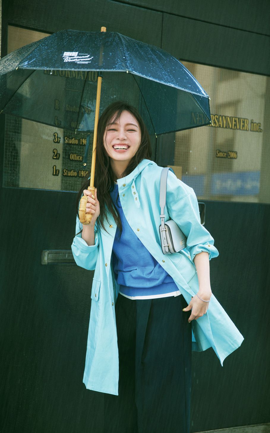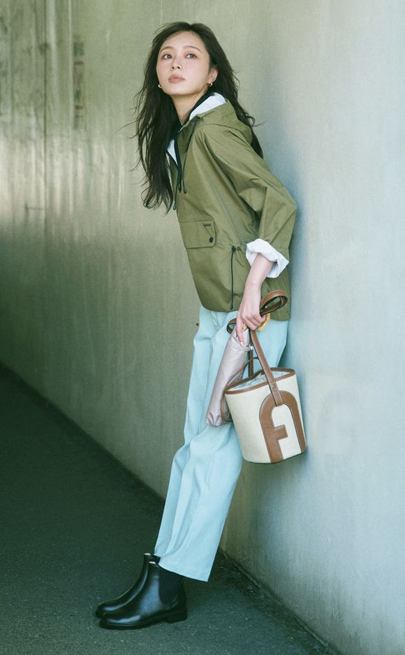 折り畳み傘はダイアナ、レインブーツはトラディショナル ウェザーウェア、アウターはバブアー、パンツはストラ、バッグはフルラのもの。