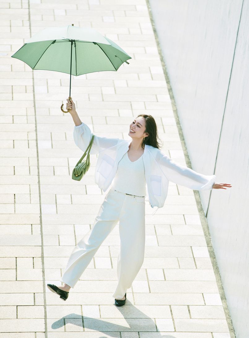 晴雨兼用モデルの傘。淡いグリーンカラーは、コーデにポイントになりつつ、主張しすぎることがないので重宝しそう。傘はトラディショナル ウェザーウェア、ブルゾンはミラ オーウェン、デニムはヤヌーク、靴はJ &Mデヴィッドソン、バッグはオソイのもの。