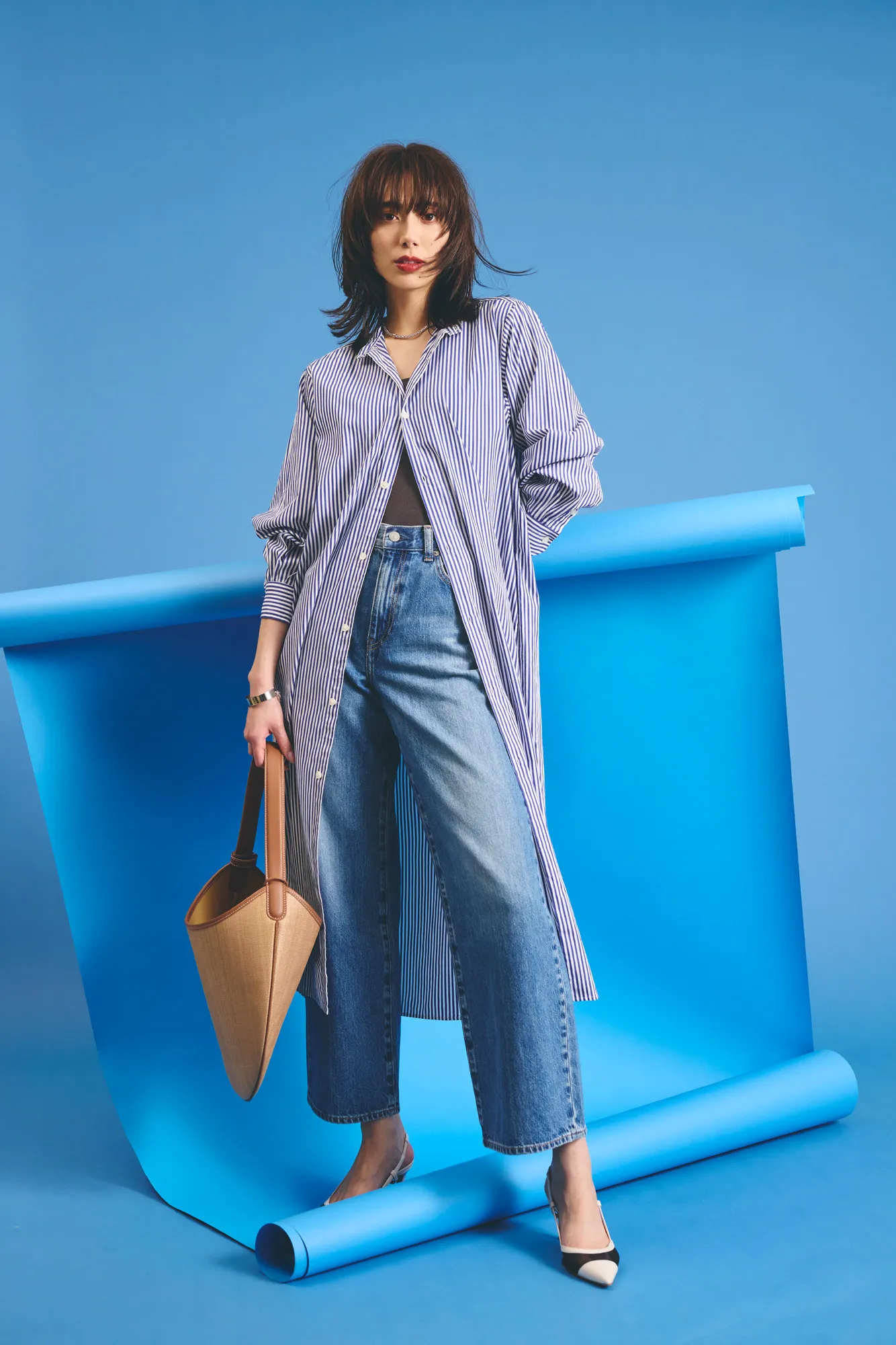 ブルーのストライプシャツワンピースは上半身だけボタンを留めてラフに着こなして。デニムを合わせればアクティブさとこなれ感が一気にアップ。ヒールを添えてほんのり女っぽさを足すことで、通勤にも休日のお出かけにも最適なバランスに。