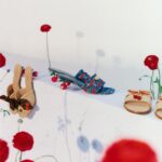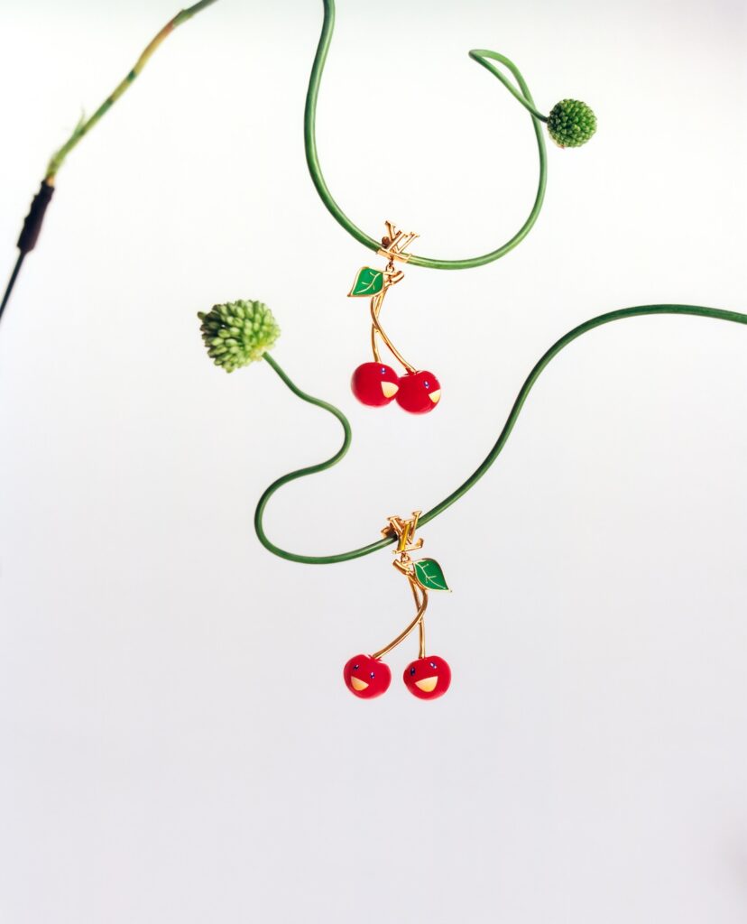 コレクションの中心となるのが、村上隆のシグネチャーとして知られるチェリーのアイコンの“カワイイ”魅力。緑の茎に鮮やかに実る笑顔のチェリー·モチーフが、最先端の応用技術や、複数の工程を要する革新的なシルクスクリーンの技法を駆使し、メゾンのクリエーションに精緻に描画されています。またこのアイコンは、ラフィアのミュールに採用されたチェリーシェイプのヒールなど、ユニークなディテールとして製品にも取入れられています。