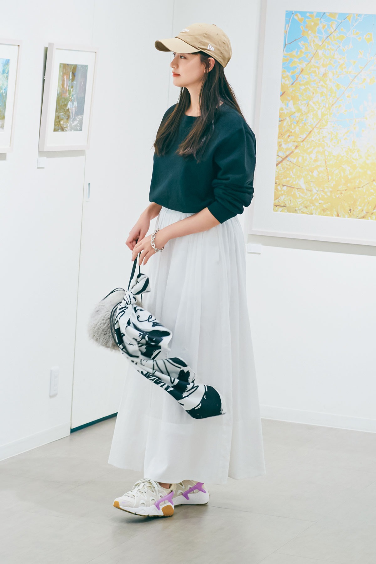 スポーティなスウェットに、ふんわりと広がるチュールスカートが好相性。キャップとスニーカーを合わせて、アート鑑賞にもぴったりな休日コーデに仕上がります。配色の引き算がポイント。