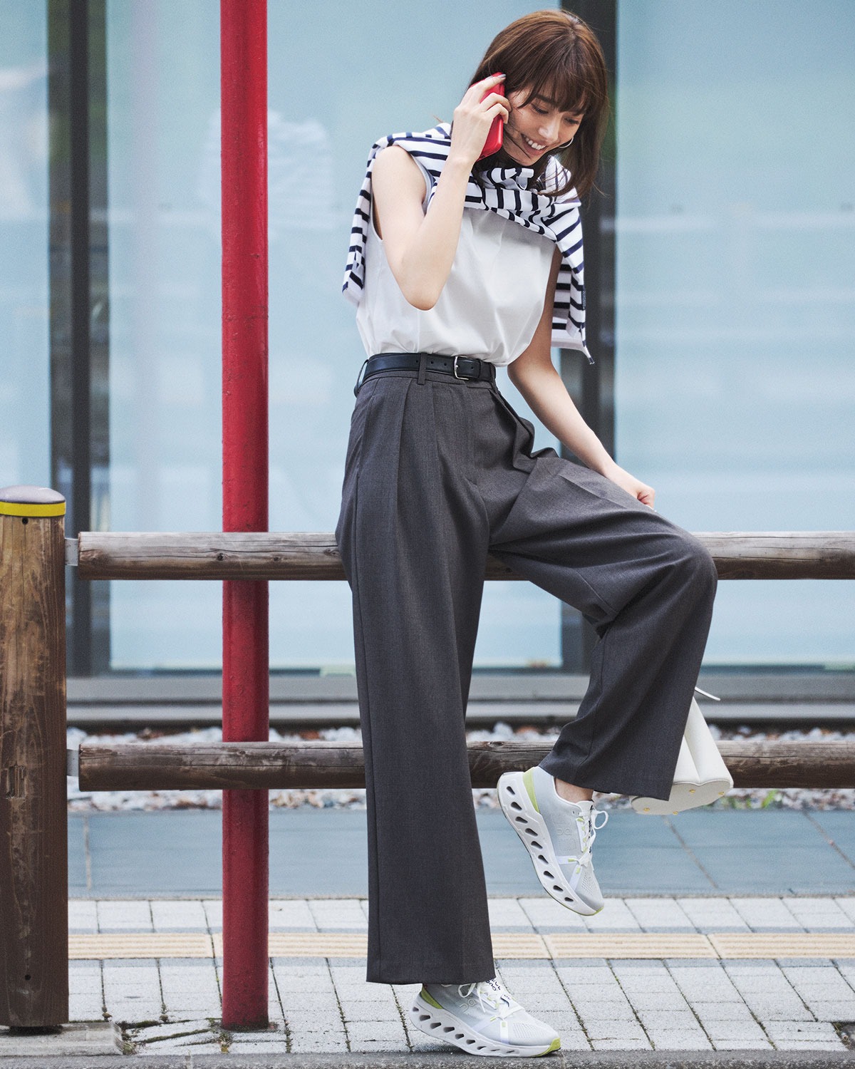 グレーパンツに白のノースリで、シンプルだけど計算された好バランス。足元はハイテクスニーカーで軽やかに。ボーダーを肩掛けするだけで、一気にこなれ感がアップします。
