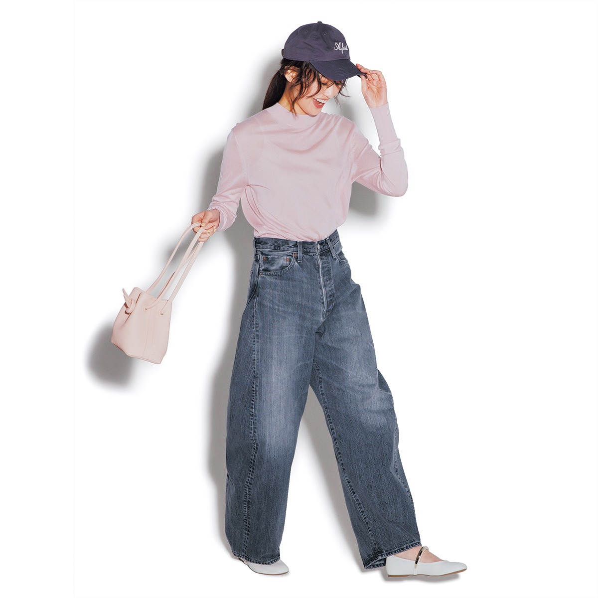 淡ピンクのニットにブルーデニムの軽さが映える春の装い。キャップ&バレエシューズでカジュアルダウンして、甘さ控えめな大人バランスに。ピンクを着慣れない人こそトライしたい。