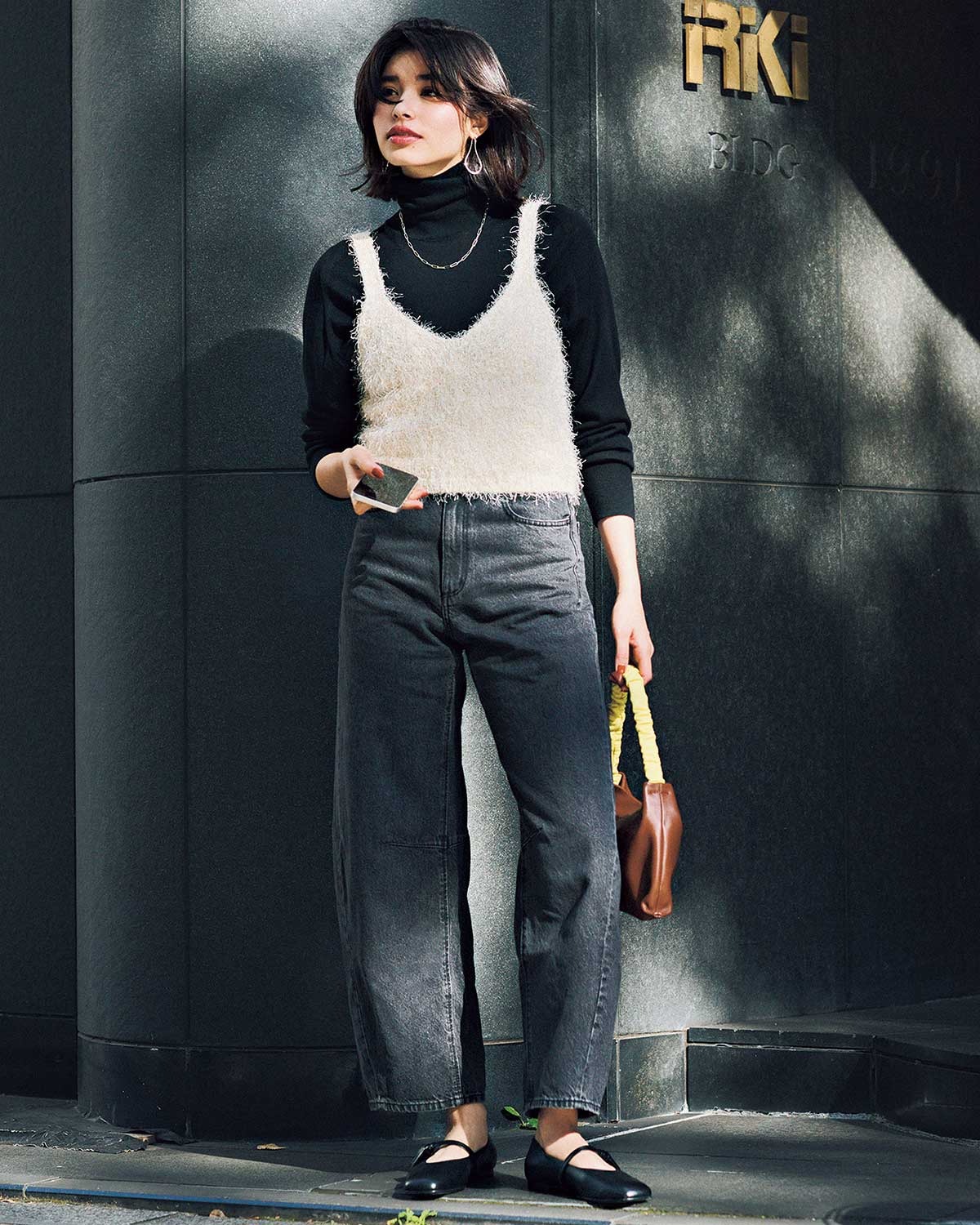 細身トップス×バレルデニムの王道バランスに、シャギーキャミでひとさじの遊び心を。色数を絞った分、シルエットで魅せる大人カジュアルなスタイリングに仕上がります。バッグの持ち方にもセンスを。