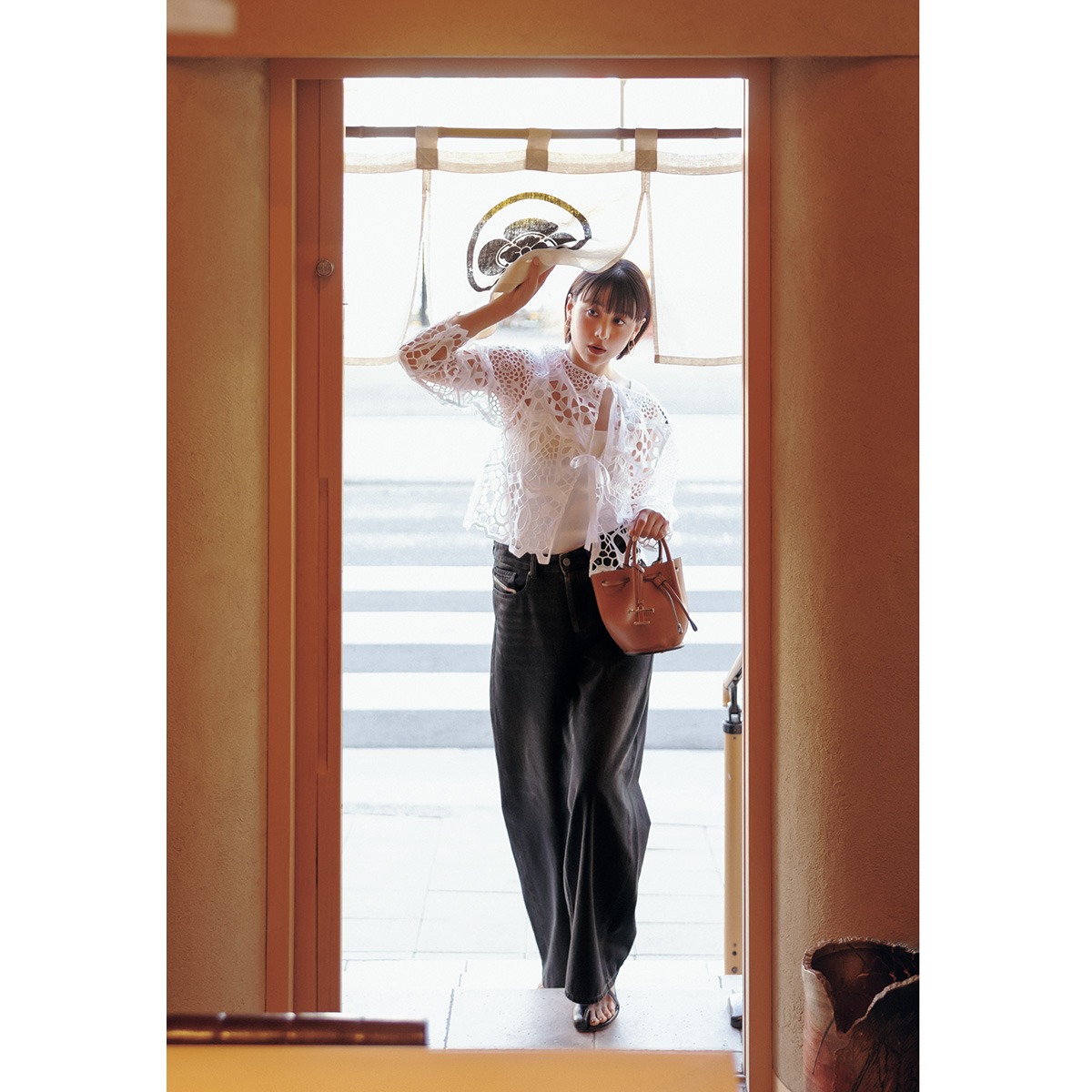 シンプルながらも後ろ姿で差がつく、色気のあるスタイリング。インディゴカラーのバレルデニムでグッと引き締めて、余裕ある大人の余白を演出。小物はコンパクトにまとめて。