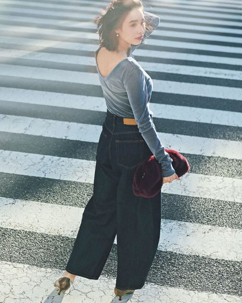 【背中開きトップス×バレルデニムで色気とこなれ感を両立】