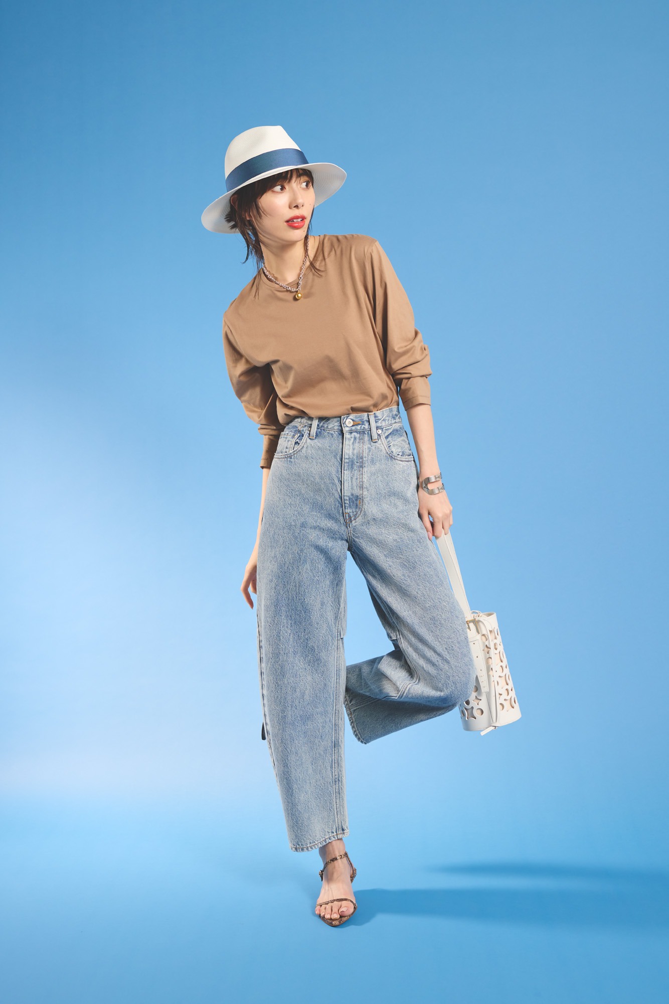 ベージュのトップスに抜け感のある小物で、リゾート気分を先取り。バレルデニムの丸みが、定番コーデに今っぽさをプラスしてくれます。涼しげなのにキレイ見えもキープできる1本。