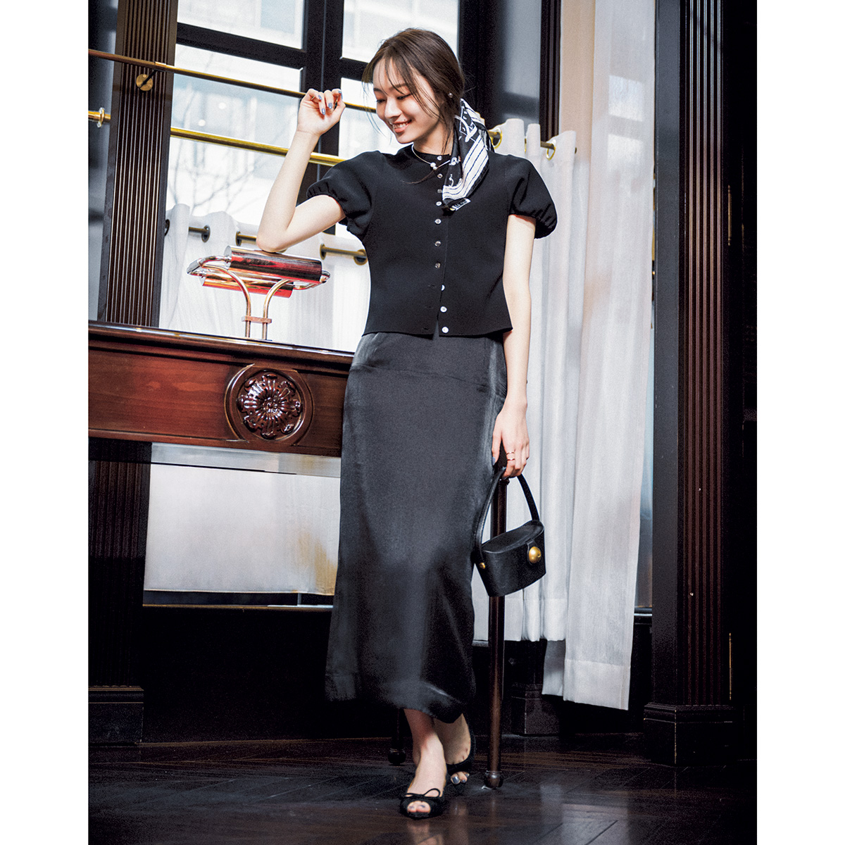 【落ち感×光沢のIラインスカートで、オールブラックに奥行を演出】