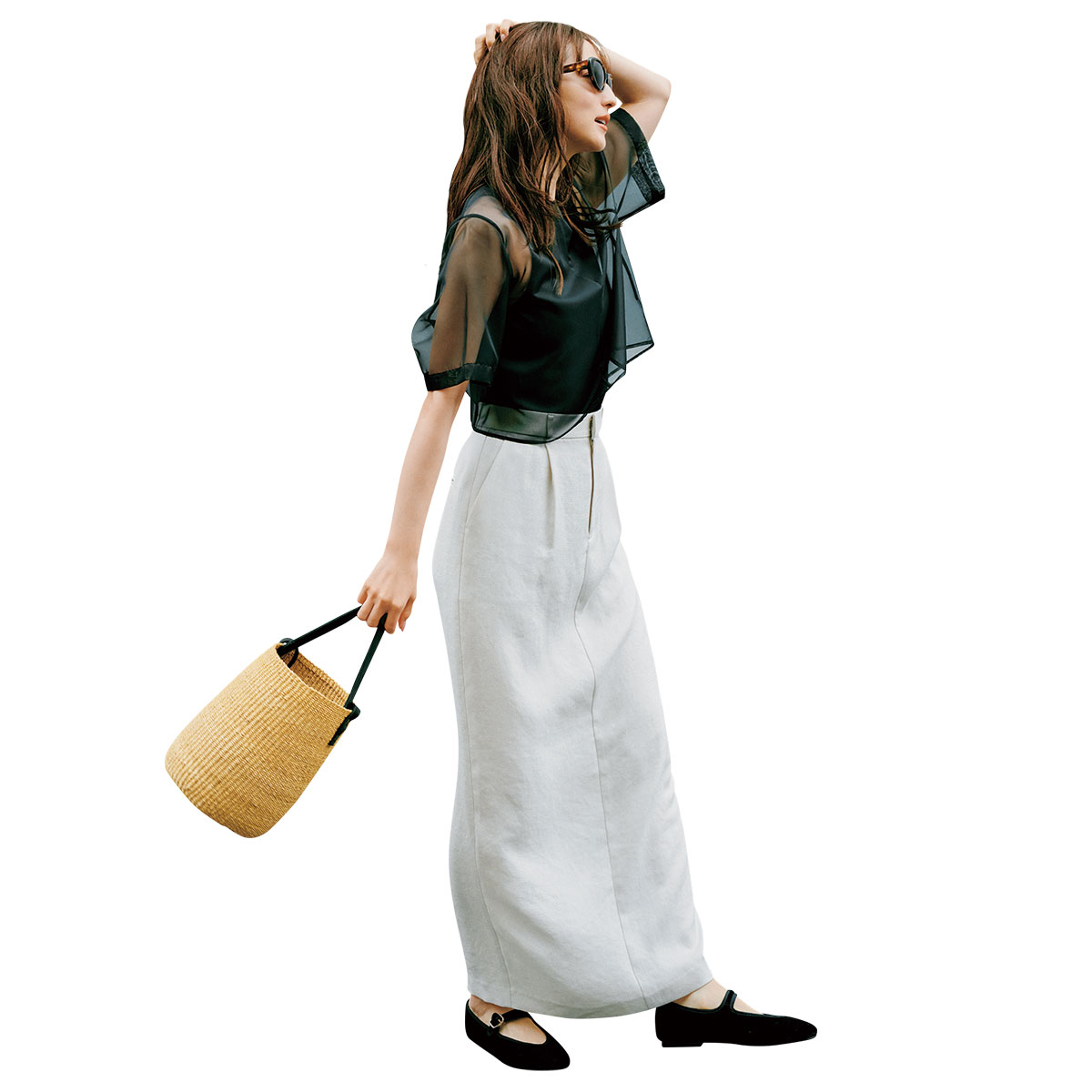 黒のシアーブラウスでほんのりモードに、白のIラインスカートで清涼感をプラス。短丈トップスで腰位置を高く見せて、自然と脚長な印象に。かごバッグを取り入れたナチュラル素材の掛け合わせが、シンプル配色にこなれ感を漂わせます。