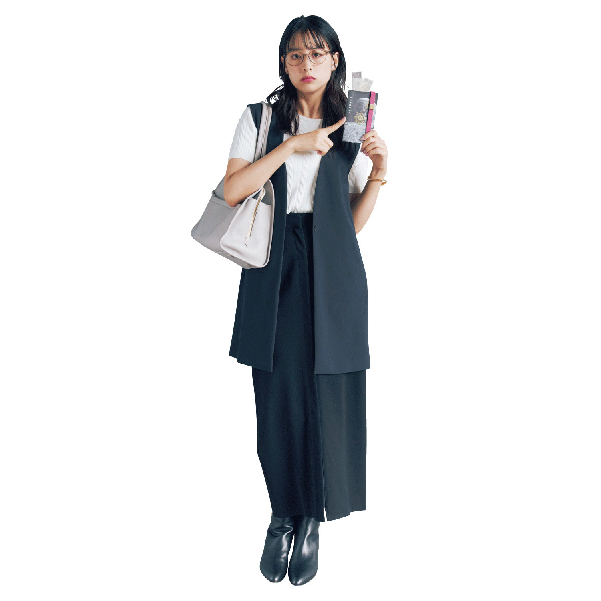 【黒のIラインで引き締め、ジレで縦ラインを強調して着痩せに貢献】