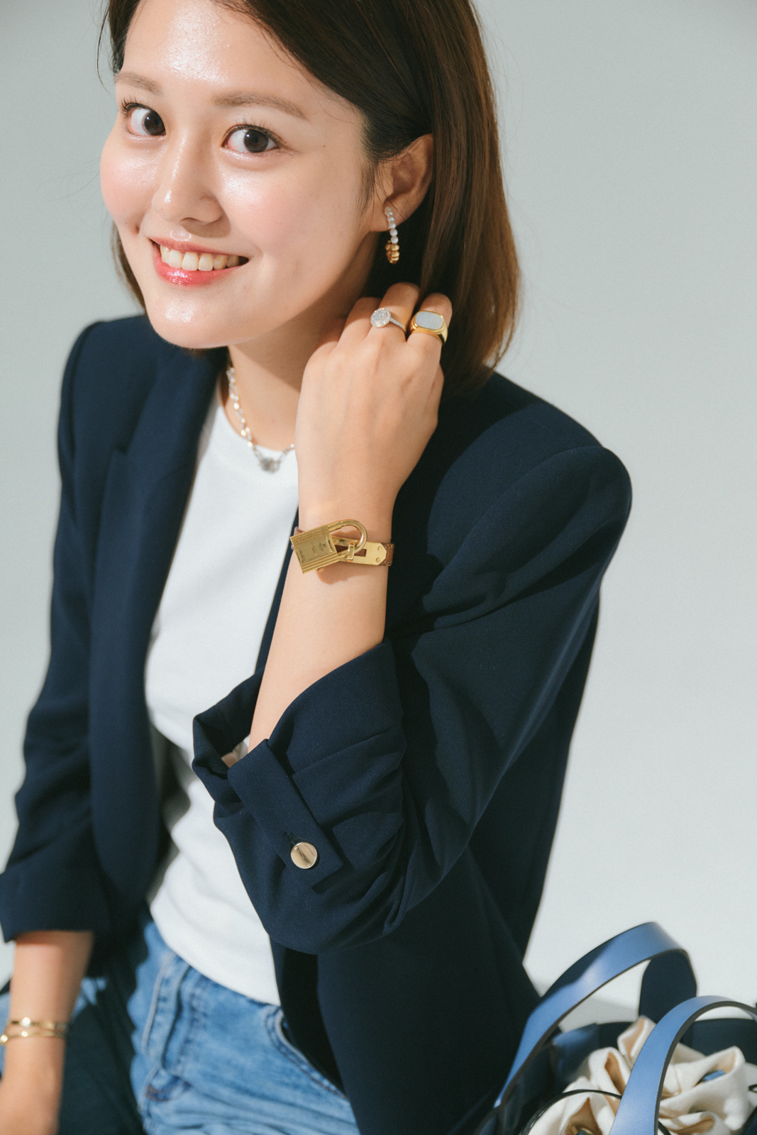 「身に着けているジュエリーにはどれも思い出がいっぱい。ケリーの時計は社会人になって母に譲ってもらったもの。カルティエのブレスレットは一昨年と去年、仕事の節目に購入。ティファニーのネックレスは友人と仲良くなって20年目記念として海外旅行のときに購入。イヤリングはリーダーズ同期の小林茉鈴ちゃんと一緒に行ったポップアップで購入したシェリッシュ。パールとゴールドの存在感にうっとりします」