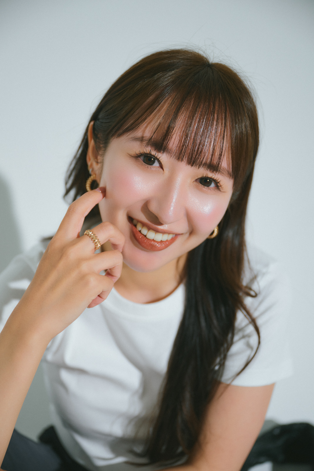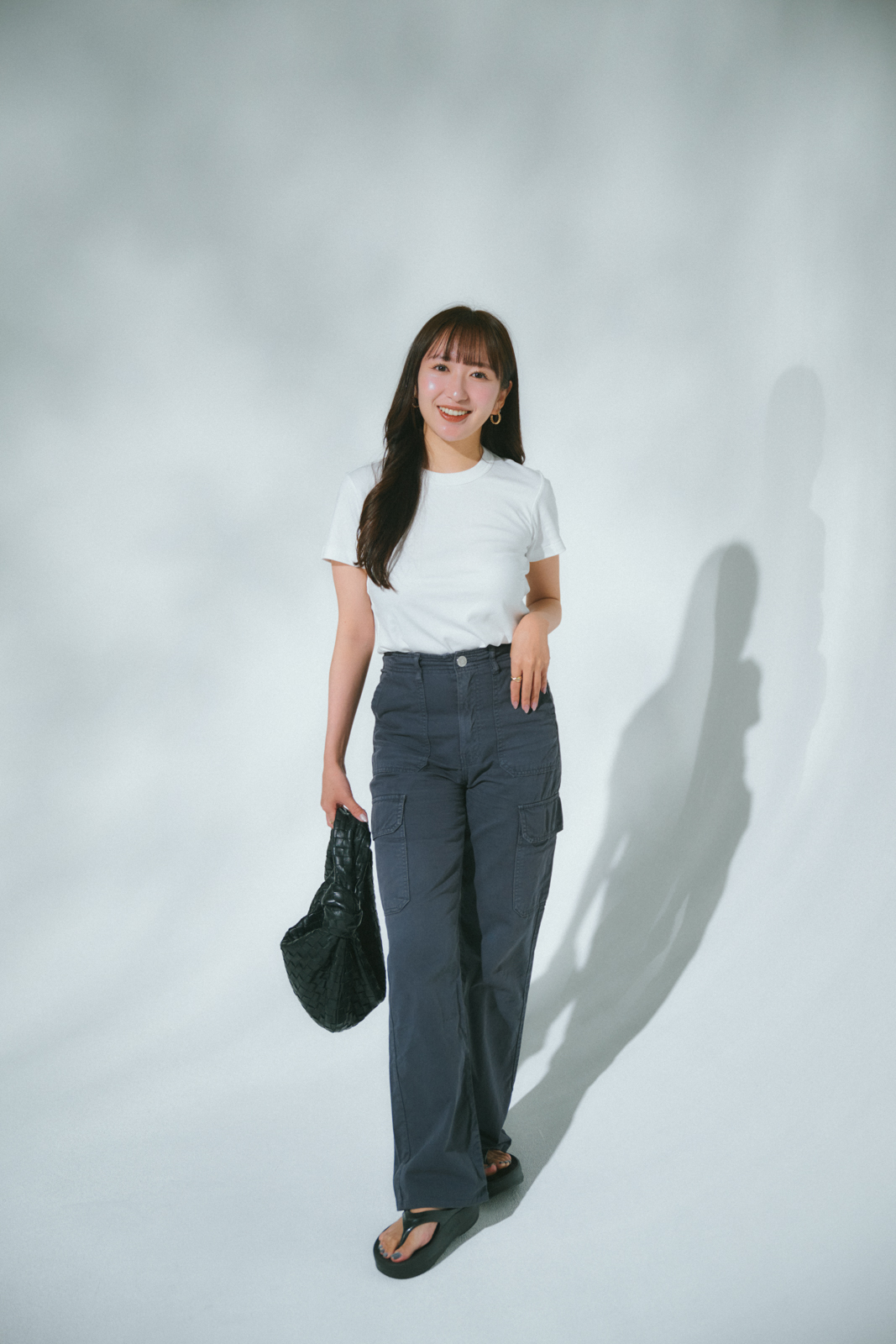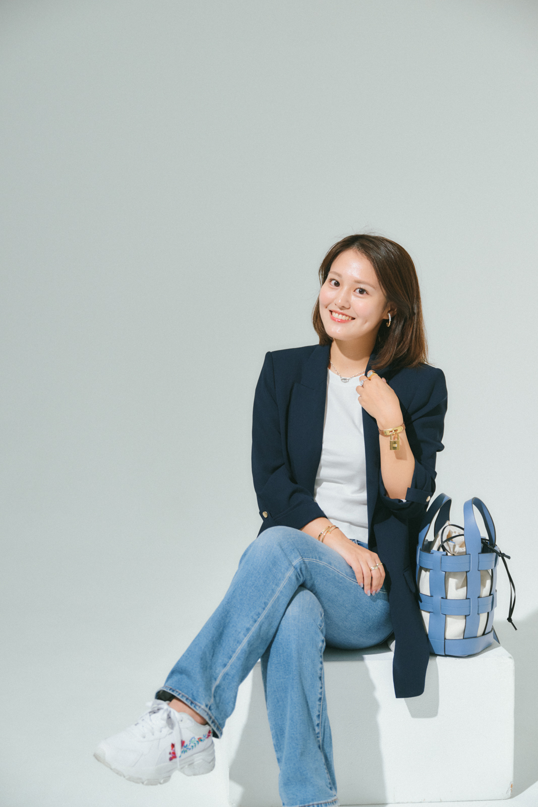 「セオリーのニットTシャツはシルエットがキレイで、ユニクロの白デニムと合わせても上品見え。小物は長く使いたいので投資する派ですが、ジュエリーはブランドにこだわり過ぎず自分が身につけていてテンションが上がるものを基準に選ぶようにして楽しんでいます」