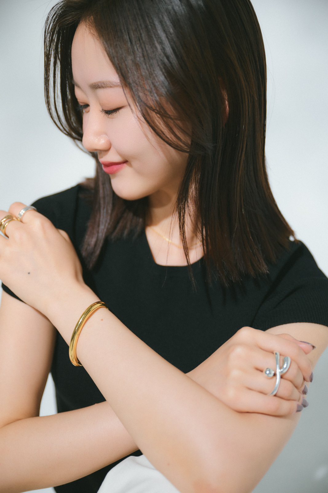 「ジャケット×Tシャツの日には、遊び心のあるジュエリーをプラスします。バングルだけでなく、ストーンが可愛いアンドエムのリングとメロウのダイヤリングで手先までしっかり華やかに」