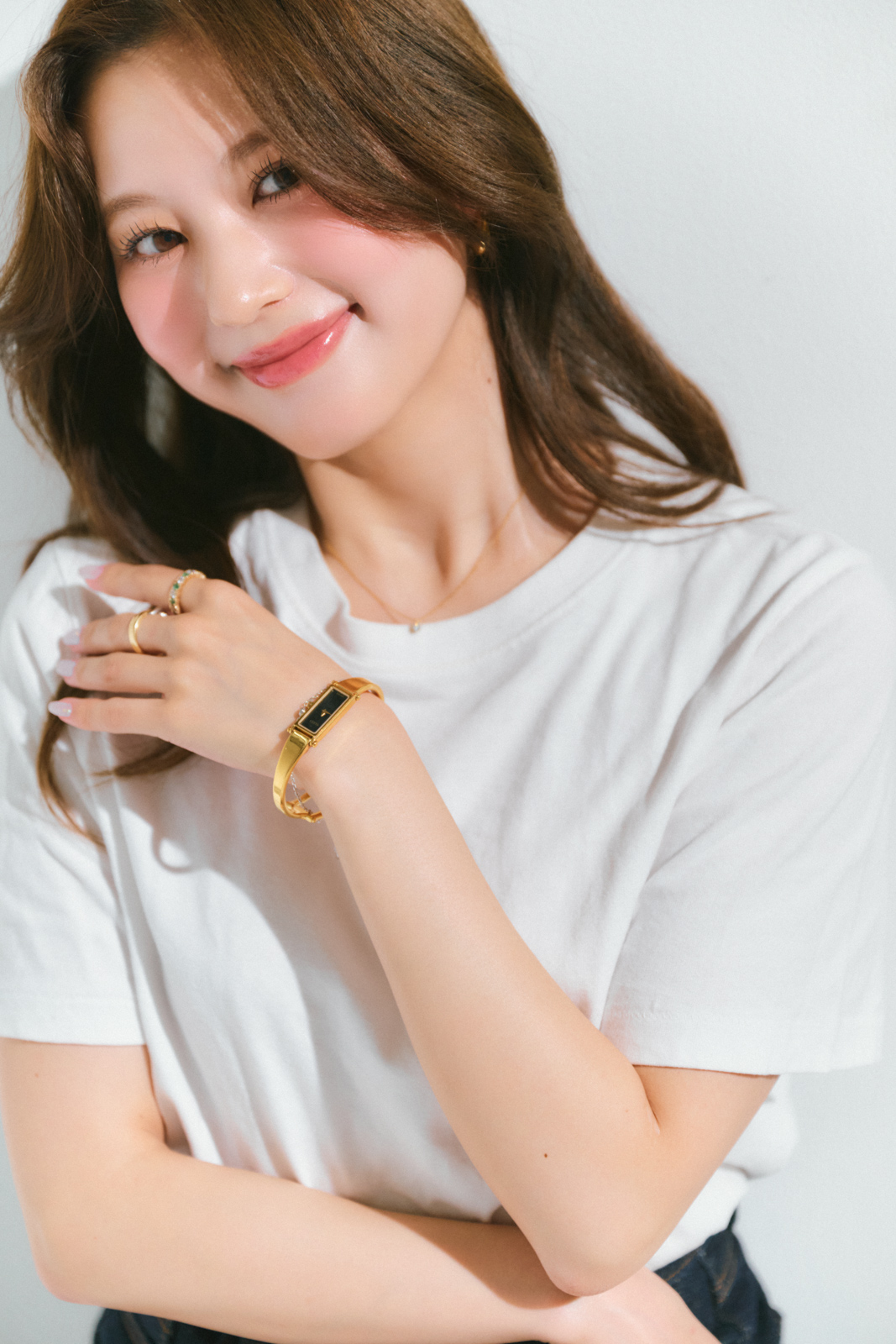 「シンプルなユニクロの白Tには、ジュエリーで盛って存在感をプラス。ガラジュエリーのネックレスにスタージュエリーのリングでボリュームを。グッチの時計は母からのおさがり。カルティエのブレスを重ねることで洒落感がグッと増します」