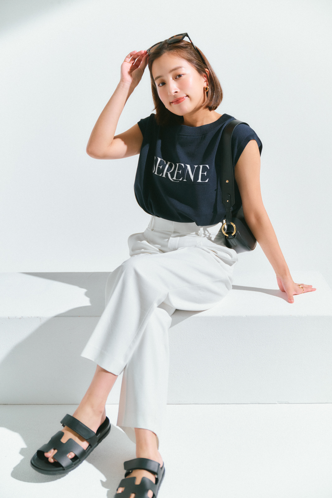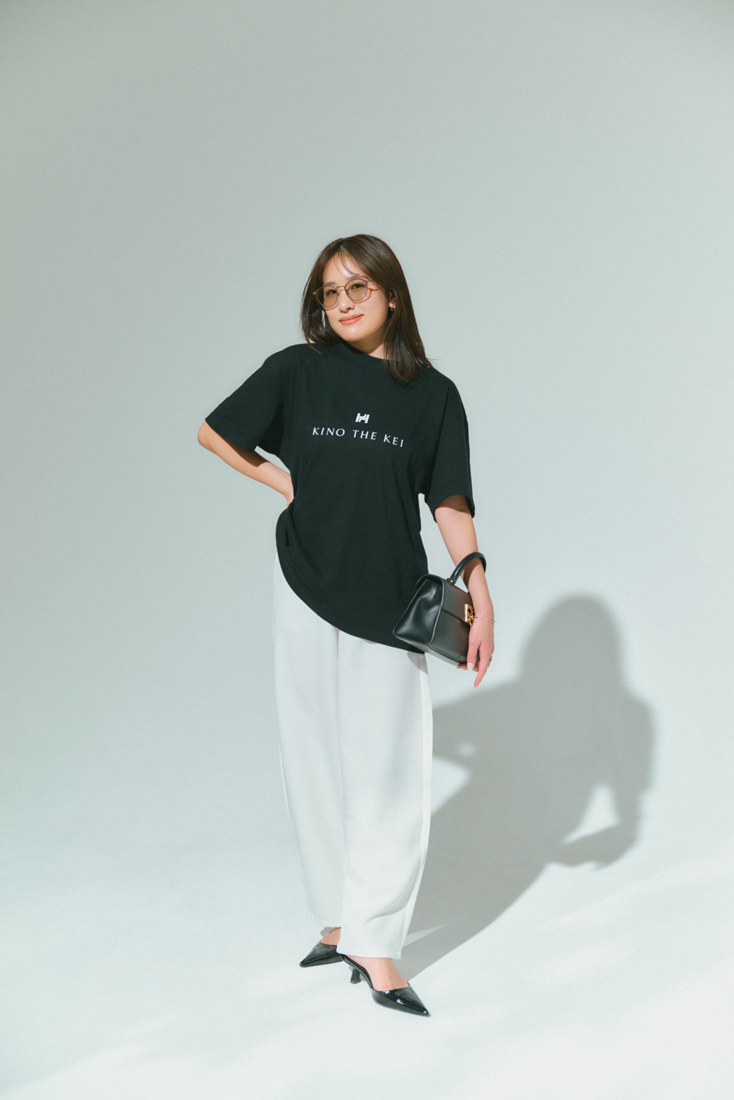 「キノ ザ ケイのTシャツはユニセックスなので程よいゆるさでこなれ感がでます。神戸レタスのきれいめパンツを合わせて大人のカジュアルコーデに。足元はヒールで女っぽさを足します」