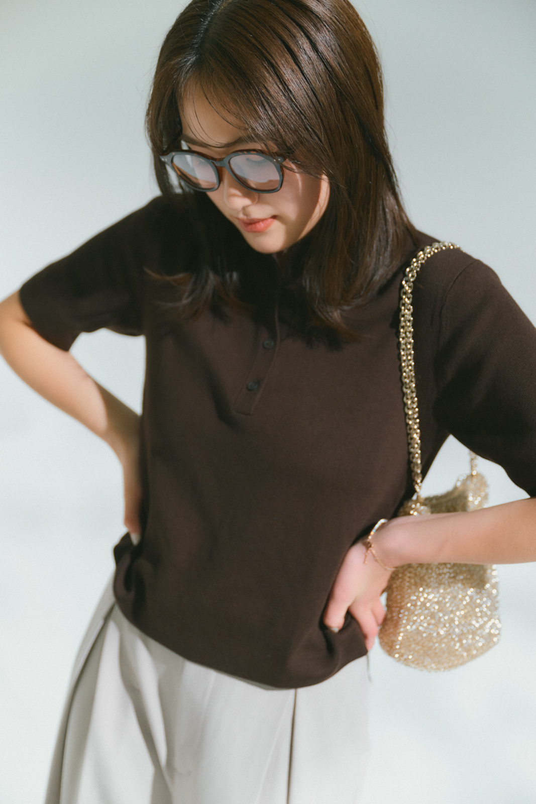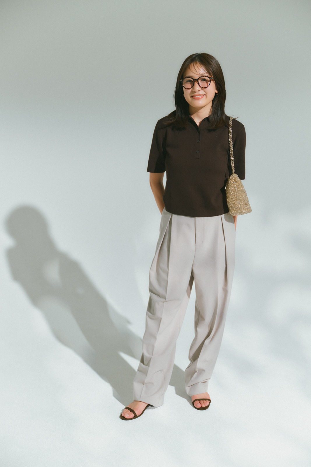 「夏のブラウンコーデが新鮮で今年らしい着こなしに。ユニクロのポロニットは、サラッとした素材と襟元のデザインが高見え。ミラオーウェンのスラックスを合わせて落ち着いたオフィスコーデにアンテプリマのビジューバッグで華やかさをプラスします」