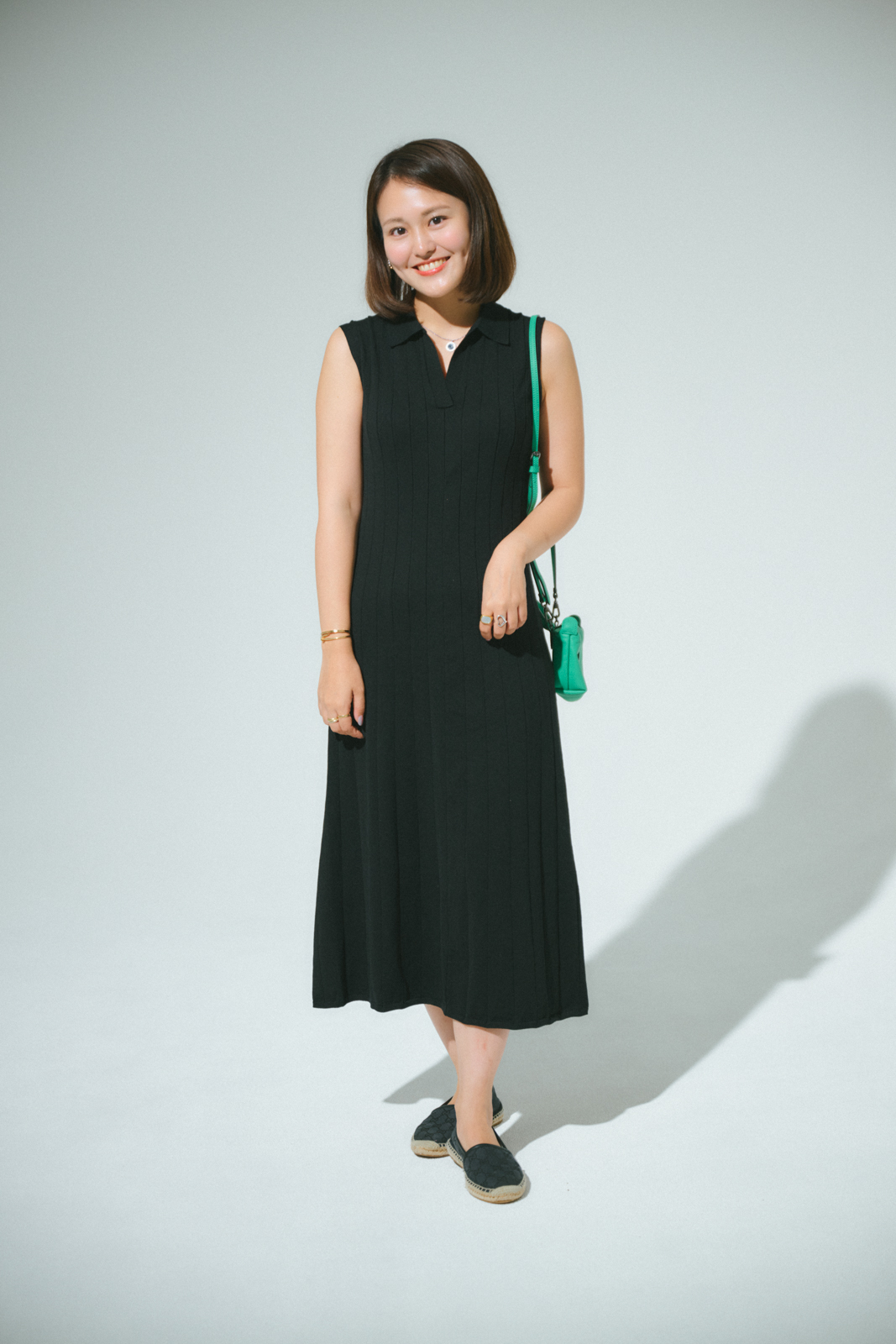 「GUのスキッパーポロワンピースはシルエットが美しく、通勤にもぴったり。コーデいらずで、1枚でサマになります。ランチタイムにはグリーンのミニロンシャンを片手に出かけることが多く、差し色としてコーデに彩りを足してくれます」