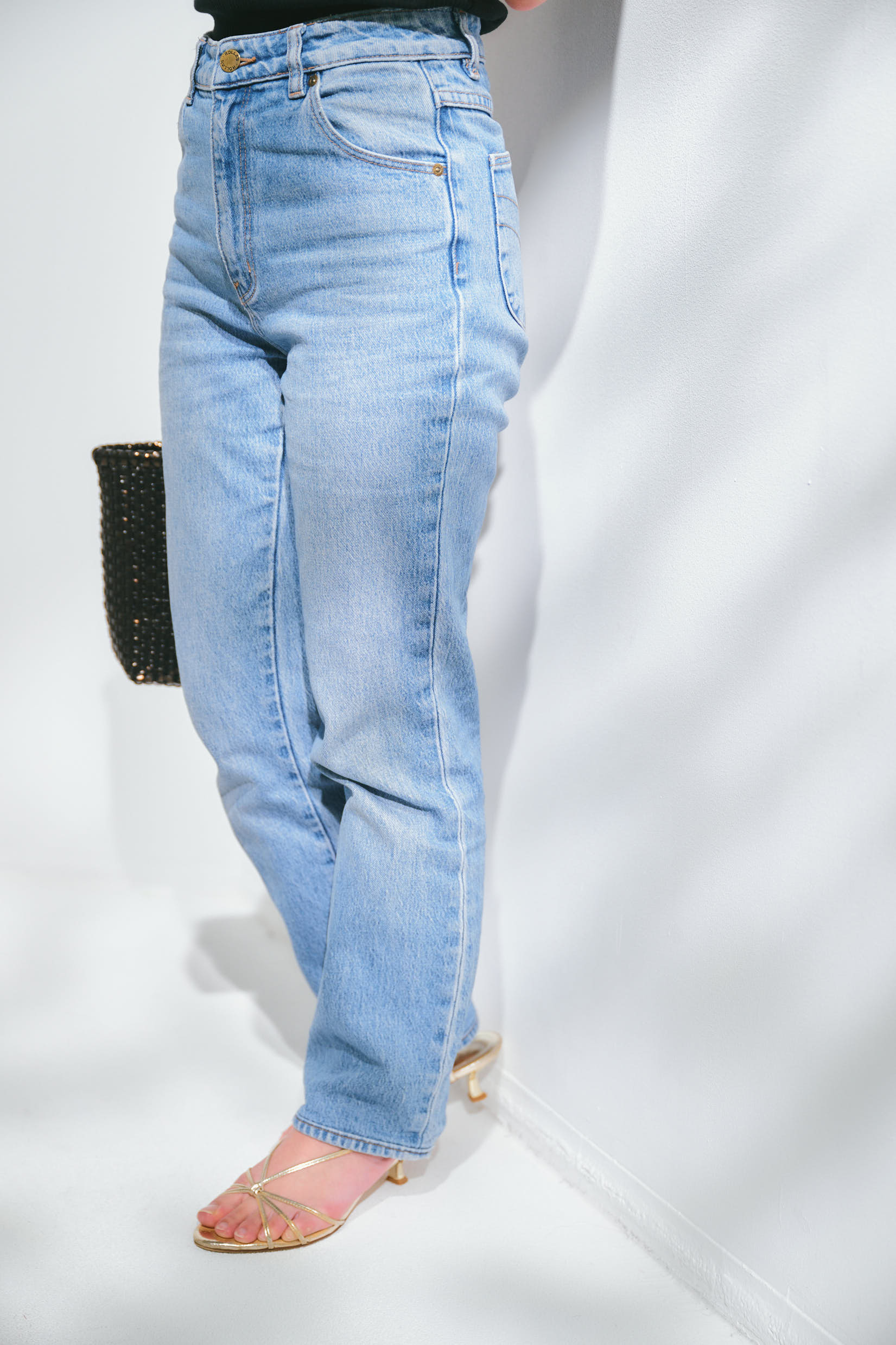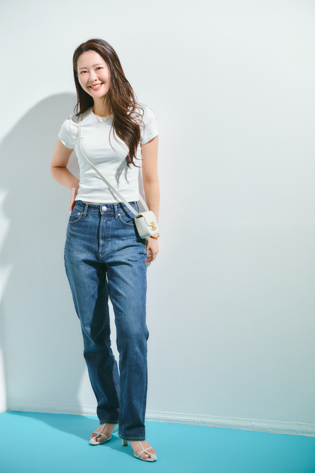 「ローラーズのハイウエストデニムは腰まわりが程よくフィットして、美脚効果があります。こなれたデニムの色味が夏らしい軽やかさを演出してくれます」
