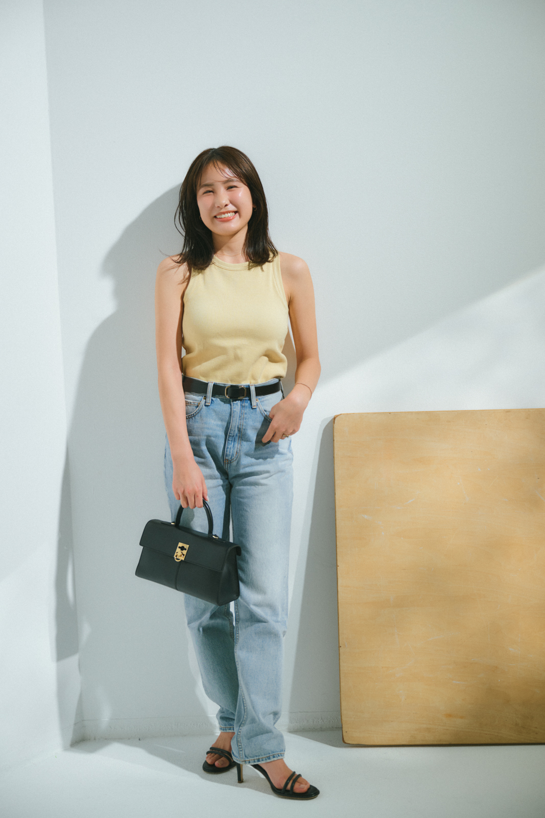 「ラフすぎない、こなれたデニムコーデが今年っぽいかなと思います。ウォッシュ加工が施されたシールーム・リンのデニムには、ミラオーウェンのイエロータンクを合わせて爽やかに。ハンサムな黒小物で締めて、大人かっこよく仕上げます」