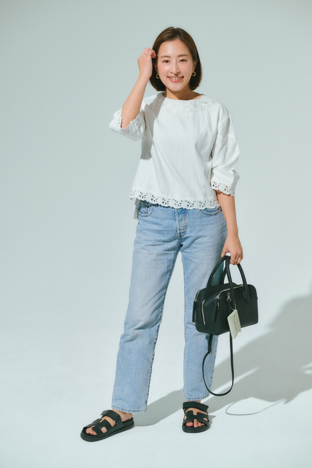 「この夏は原点回帰でリーバイスのデニムをたくさん履きたい気分。最近も2本追加で購入したほどハマっています!トップスはMERIと先輩リーダーズの鈴木詩織さんのコラボ。爽やかなデニムコーデは、黒小物で大人っぽく格上げします。ヴァジックのバッグは容量もたっぷり入ってオンオフ問わずに稼働率高めです」