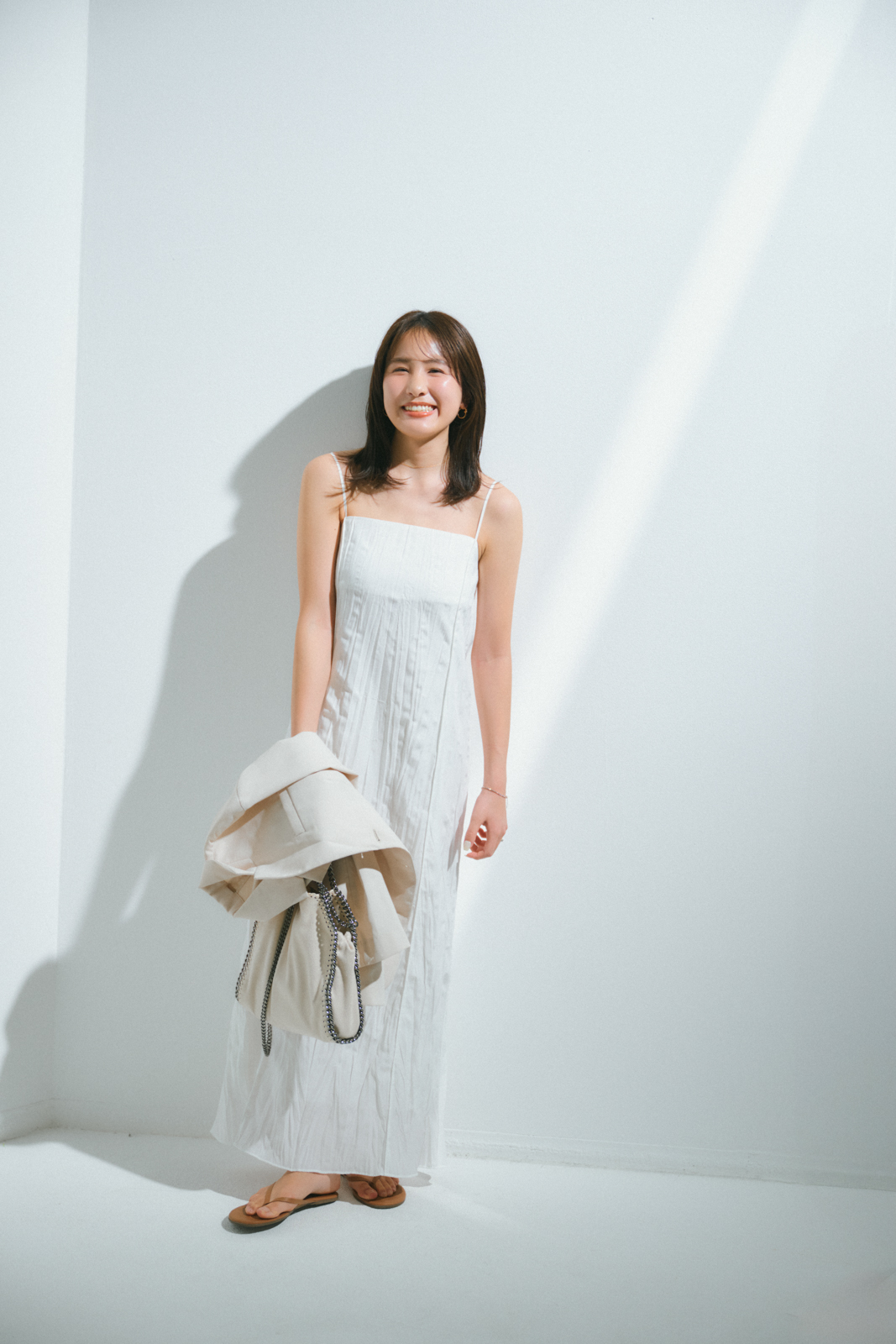 「夫とのドライブデートに着ていきたい夏のリラクシーコーデ。リブジョアのワンピースはIラインシルエットが涼しげで、ビーチにも映えそう。トゥモローランドのジャケットは車内の冷房対策に。足元はTKEESのビーチサンダルで抜け感を出します」
