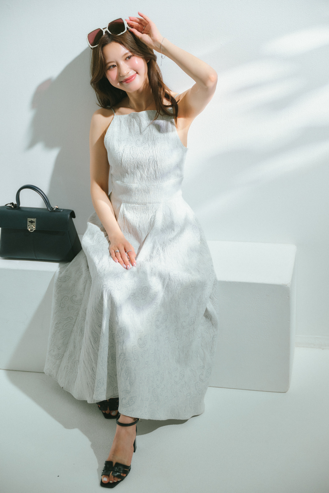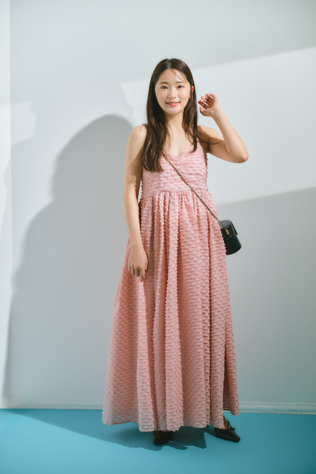 「このワンピースは着痩せ効果もあってスタイルよく見えるのも嬉しい。背中も空いているデザインで抜け感が出ます。ディレクターの楫真梨子さんのこだわりが細部にまで詰まっていて、着るたびに買ってよかった!って思っています」