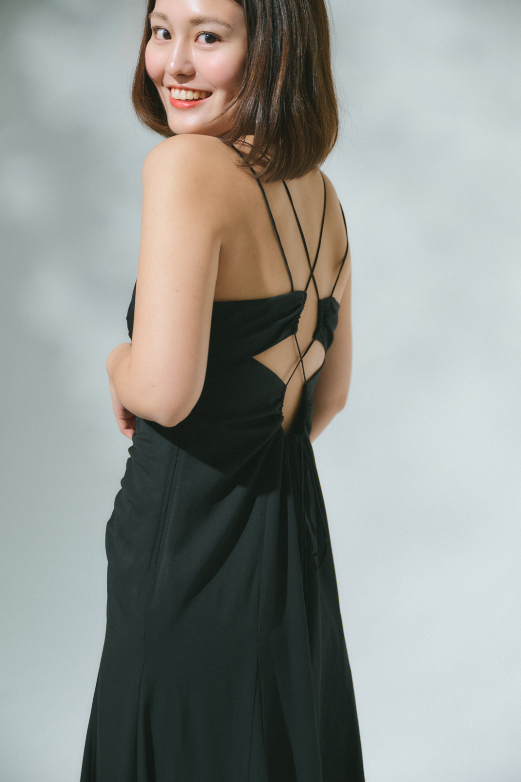「紐をクロスさせた背中のカットアウトが特徴的でキャッチーな1枚。ほんのりモードなデザインが効いていて、ちょっとしたディナーにも映えると思います。存在感がありつつも、品よく仕上がるのがエステラKらしくてお気に入りです」