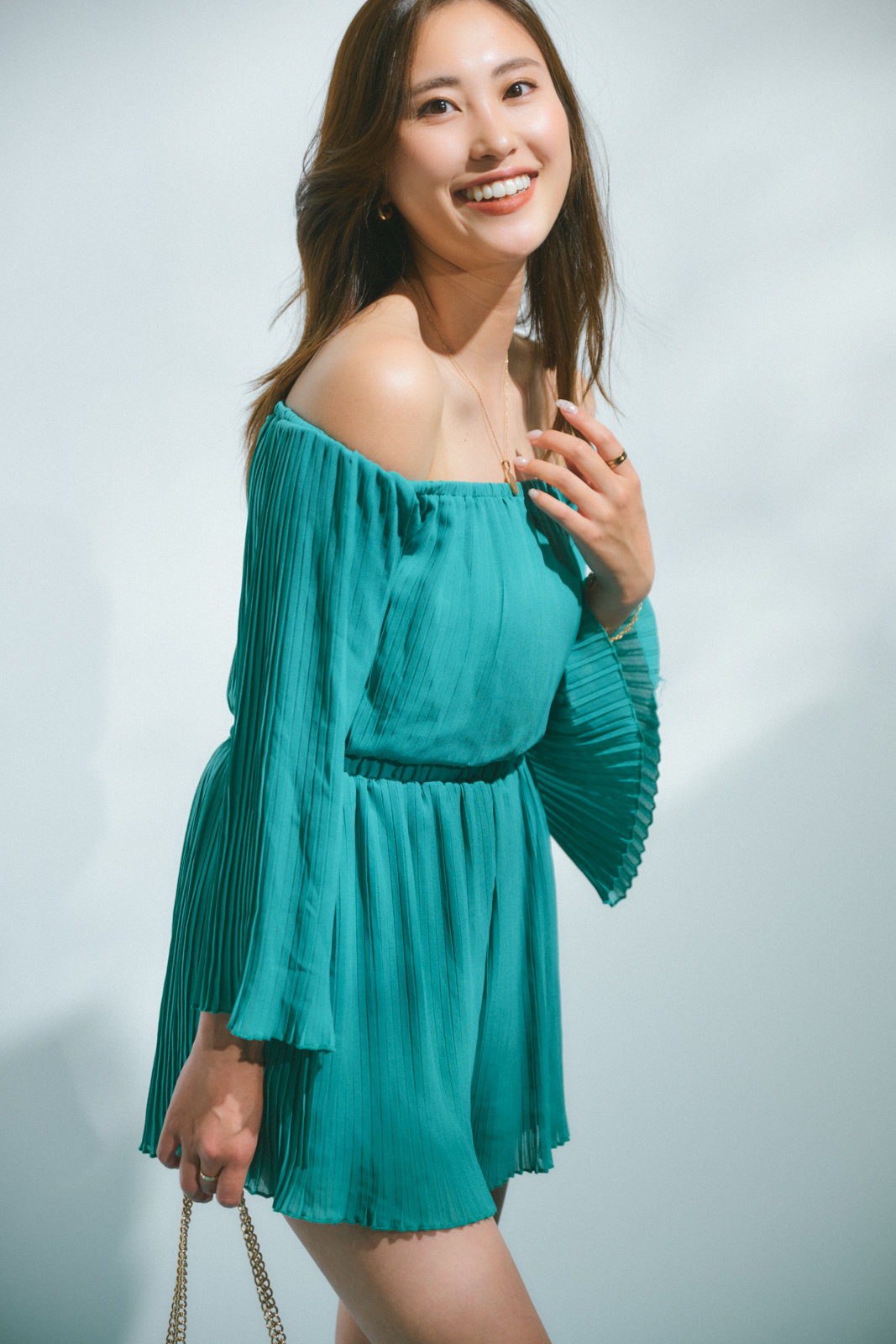 「全体にプリーツが入っていて、サラッとした生地だから気温が高いリゾート地でもノーストレスで着られます。オフショル×ミニ丈で肌見せしつつ、ロングスリーブだから大人っぽさもキープ。旅先でさらっと着たい1枚です」