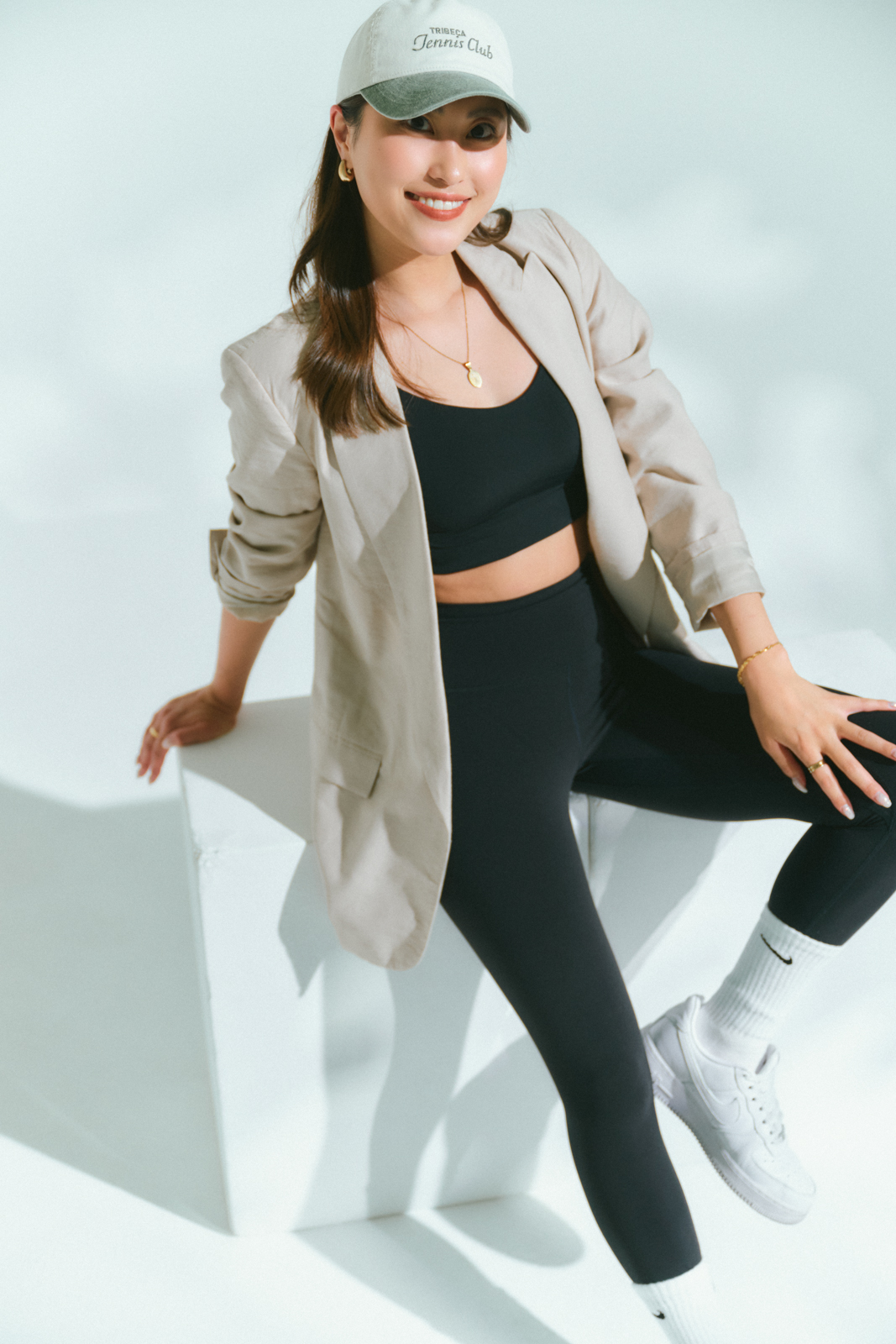 「ワークアウトの日のスタイルは部屋着に見えないように気をつけています。トップスはそのまま1枚だとラフすぎるのでザラのジャケットを羽織ってきちんと感をプラス。ヒップまでしっかり隠れる丈だから移動やカフェもOKで便利です」