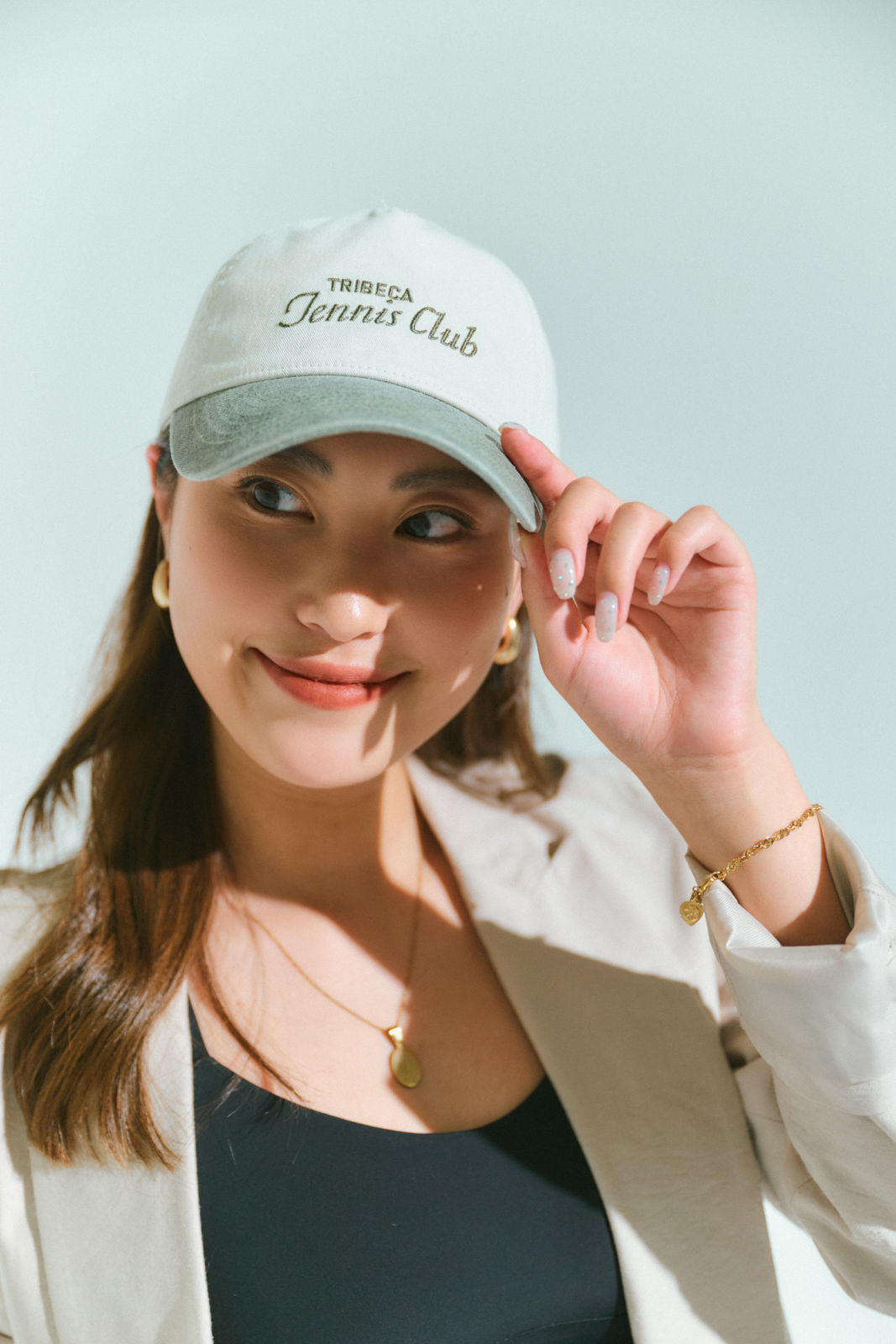 「キャップはあえてベーシックカラーでないものを選んで、遊び心を足すと洒落見えします。小物でメリハリを出すことで、シンプルでも野暮ったく見えず、ヘルシーでこなれた印象に。気分が上がると、ワークアウトも頑張れます!」