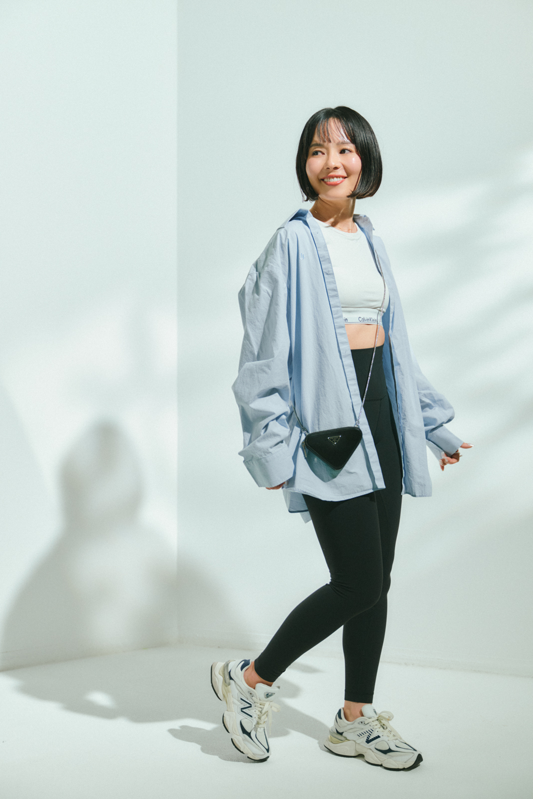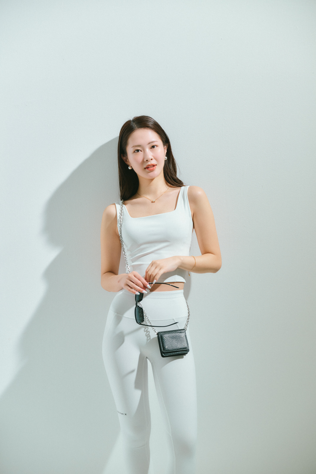 「ワークアウトウェアはモノトーンでモードっぽくまとめるようにしています。白のウェアは透けが気になるので、ユニクロのシームレスパンツを合わせて。ウエア以外のサングラスやバッグなどはハンサムな黒小物でメリハリをつけるようにしています」