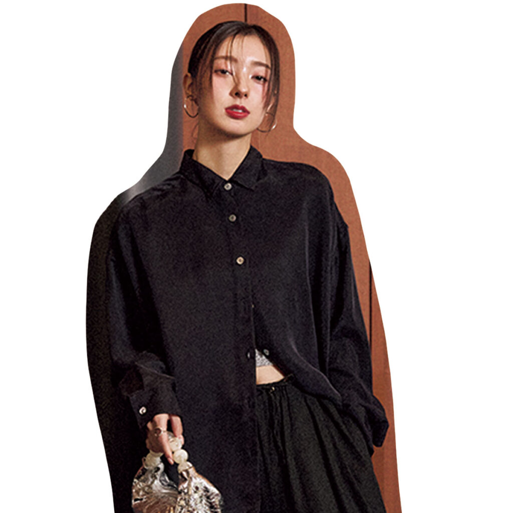 ボタンを開けて、肌見せすることでオール黒紺コーデに抜け感をプラス。ラメトップスの派手さをシャツのとろみでバランス調整。シャツ〈タンクトップとセット〉¥28,600(マルモア╱DMC)Tシャツ¥17,600(SEA╱エスストア)パンツ¥15,400(バンヤードストーム╱エレメントルール)バッグ¥15,400(セピカ╱ジオン商事)靴¥35,200(YOAK╱UTS PR)イヤリング¥3,520(mimi33╱サンポークリエイト)リング¥6,600(ラ・スール)