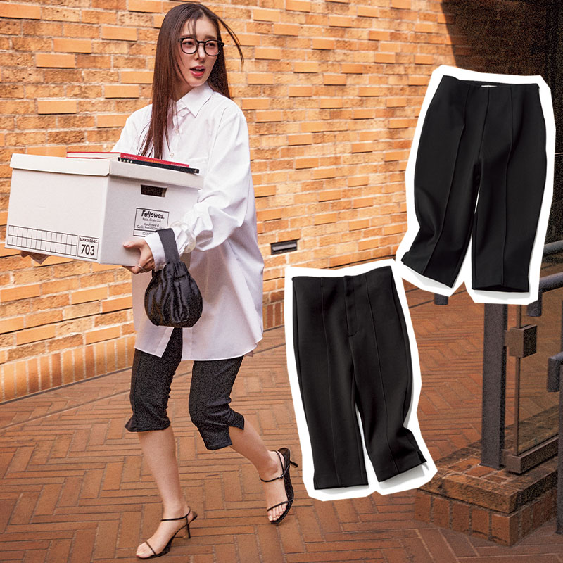 1.ロゴタンクトップ¥9,300(Rest & Recreation/ユー バイ スピック&スパン ルミネ池袋店)ブラウス見え白シャツ¥34,100(ORR/ノーブル 有楽町マルイ店)ショルダーバッグ¥15,500(トゥティエ)バッグ¥15,180(イムラム)メガネ¥38,500(SPRING STRINGS/SHOWROOM CHRMR)イヤカフ¥13,200(アルティーダ ウード)リング¥13,200(ラ・スール)スーツケース/スタイリスト私物 ネイビーラインパンツ着回し