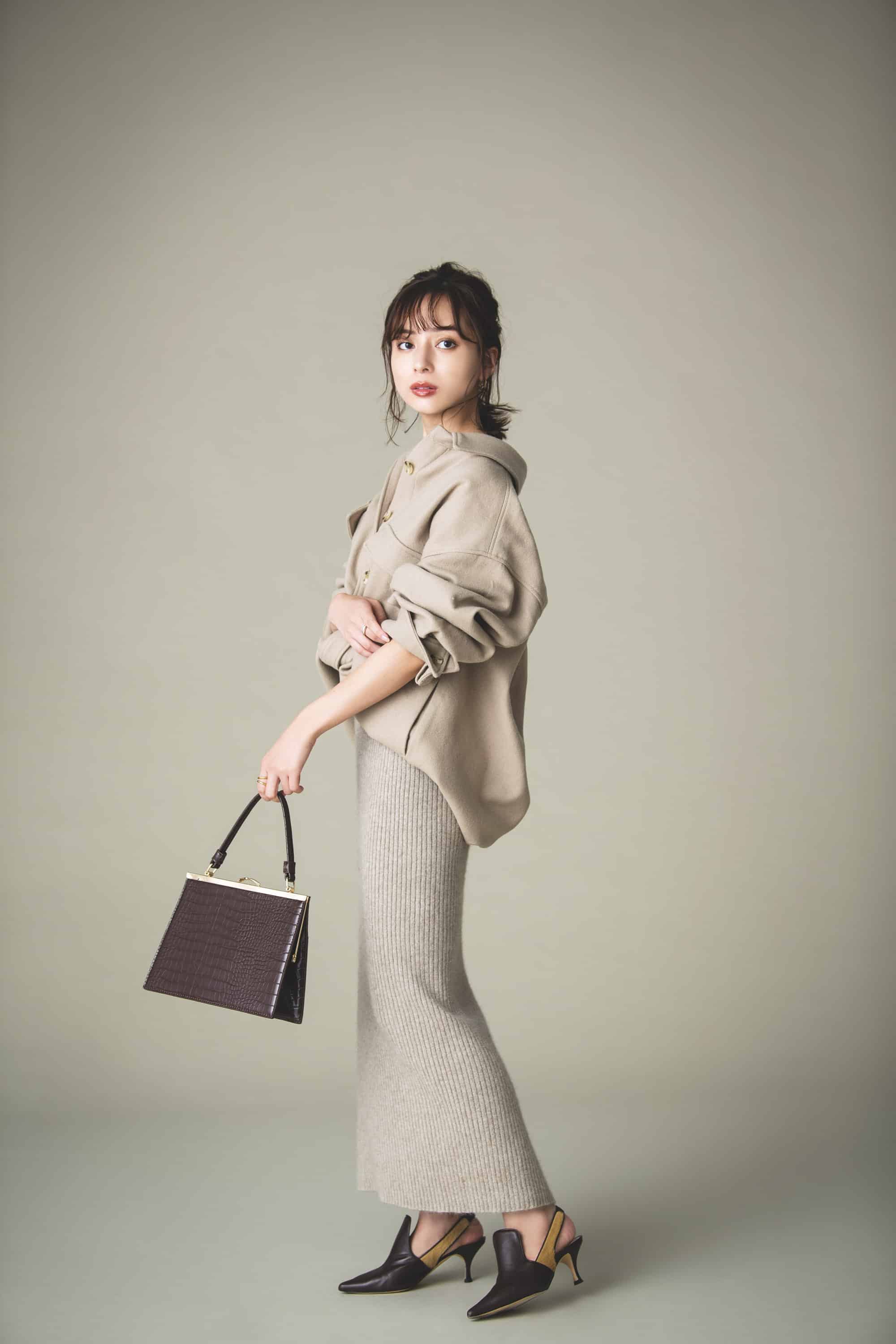 さらりとしたクセのないワントーンスタイルはそれだけで大人っぽく仕上がるのでよく着ています。しかもワントーンはスタイルアップにも有効なので、Sサイズにおすすめの着こなし。特にこの秋冬は、薄めのベージュにブラウンの小物を合わせるのがお気に入り。ワントーン配色のときは、なるべく薄ベージュや薄グレーなど明るめのトーンを選んで、優しい雰囲気になるように気を付けています。さらに、どこかに身体のラインが出るアイテムを取り入れるのがポイント。このコーデだと、ベージュのリブのロング丈ニットスカートがキーアイテム。そして、同じトーンのCPOジャケットを襟抜きして着ることでこなれ感を取り入れています。