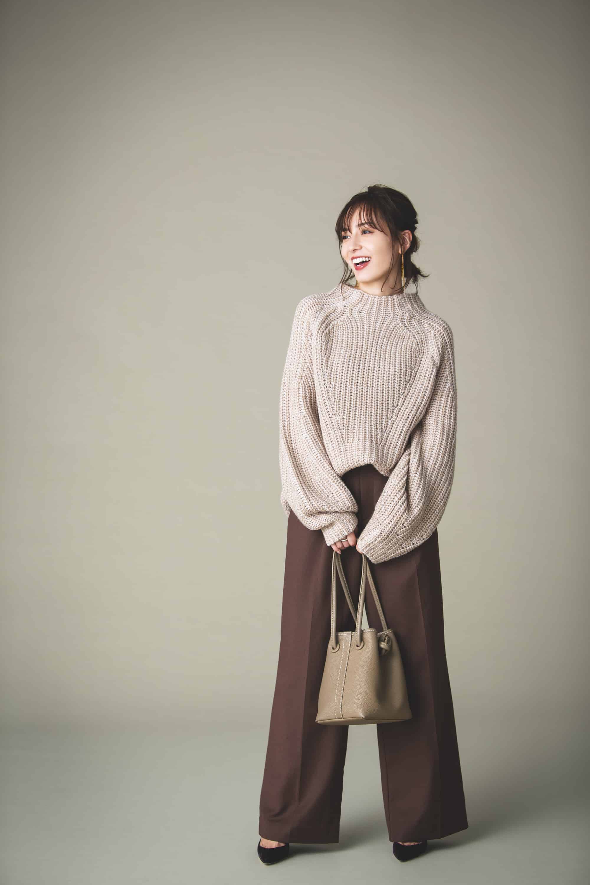 甘めな顔立ちなのもあってコンサバな洋服がつい古く見えてしまいがちなんです。そこでハイネックニットやタイトスカートなどのコンサバなアイテムを着るときは、極力アイテム数や色味を抑えることで大人っぽさをキープしています。今回はニットとスカートだけのワンツーコーデにすること、白×茶の2色に押さえること、さらにデザインもクセのないアイテムを選んでいます。
