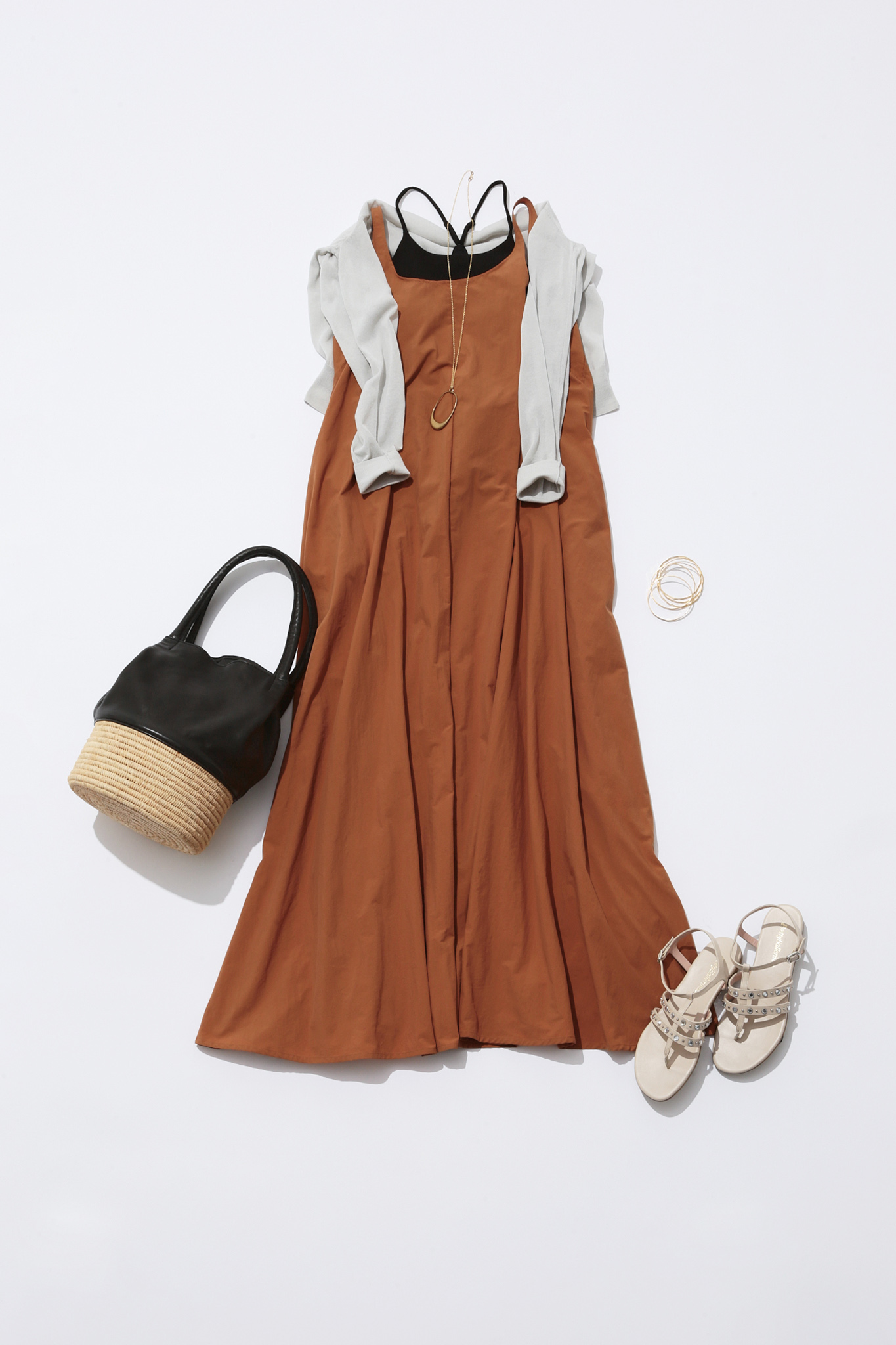 キャミソールはカップ付きで背中開きのワンピースにも合わせやすく、とろみ素材なので一枚で着るときもピタッとしすぎず体型カバーにも最適。上に羽織るカーディガンはトレンドのシアー素材だから、昼と夜の気温が異なる時期や冷房対策に一枚持っておくと助かるアイテムです!