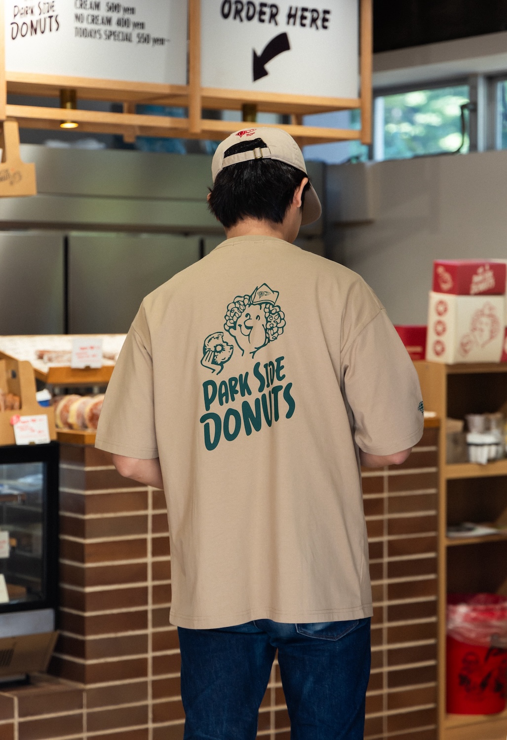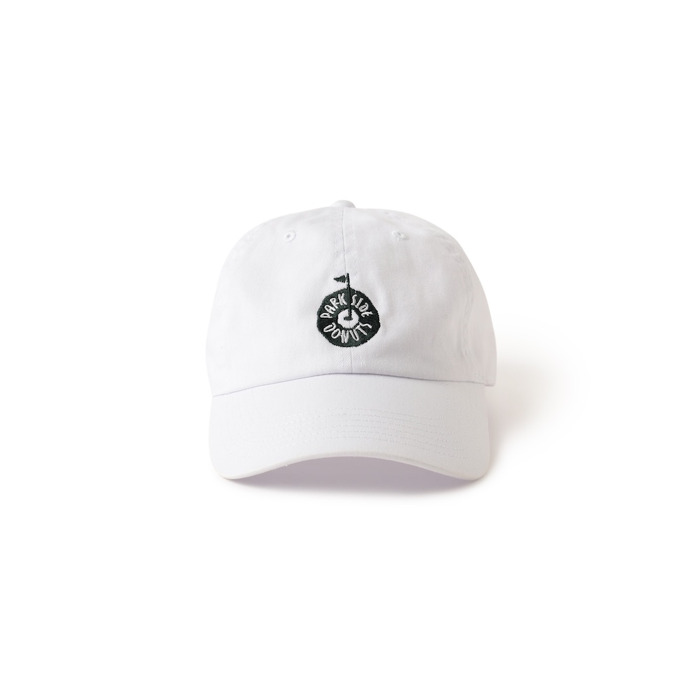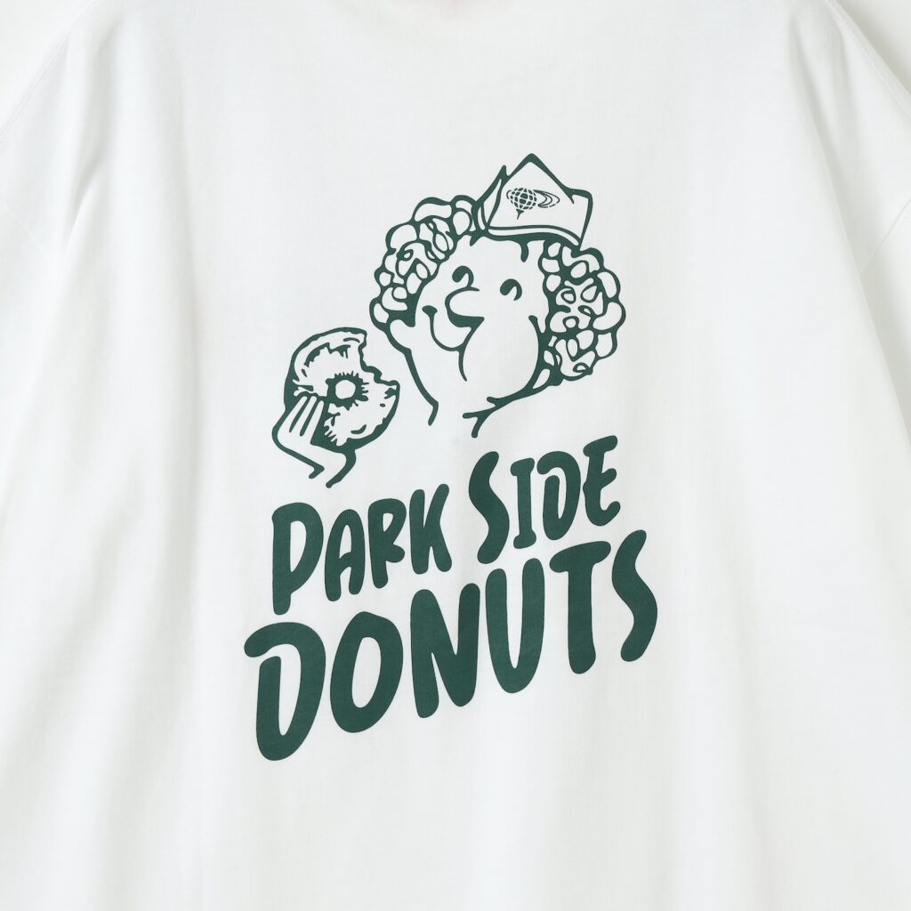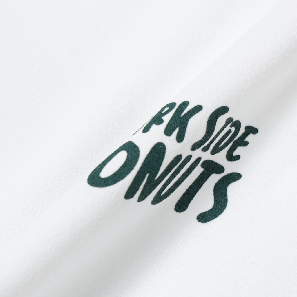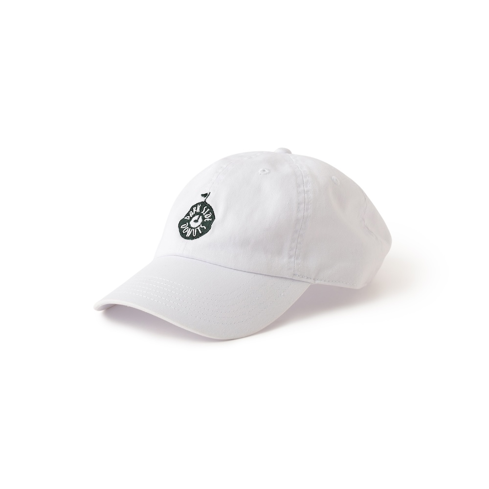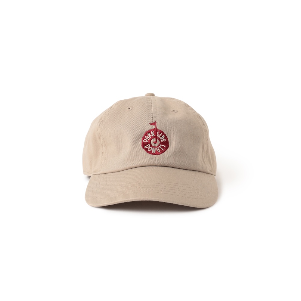 フロントセンターにドーナツロゴをグリーンに見立てたスペシャルロゴを刺繍。カラーはWHITE×GREENと「PARK SIDE DONUTS」のオフィシャルカラーBEIGE×DARK REDの2色展開。