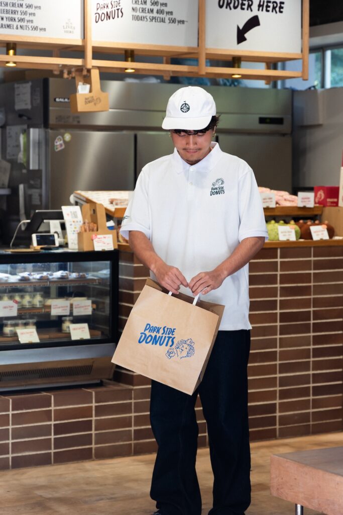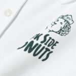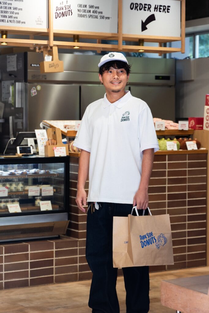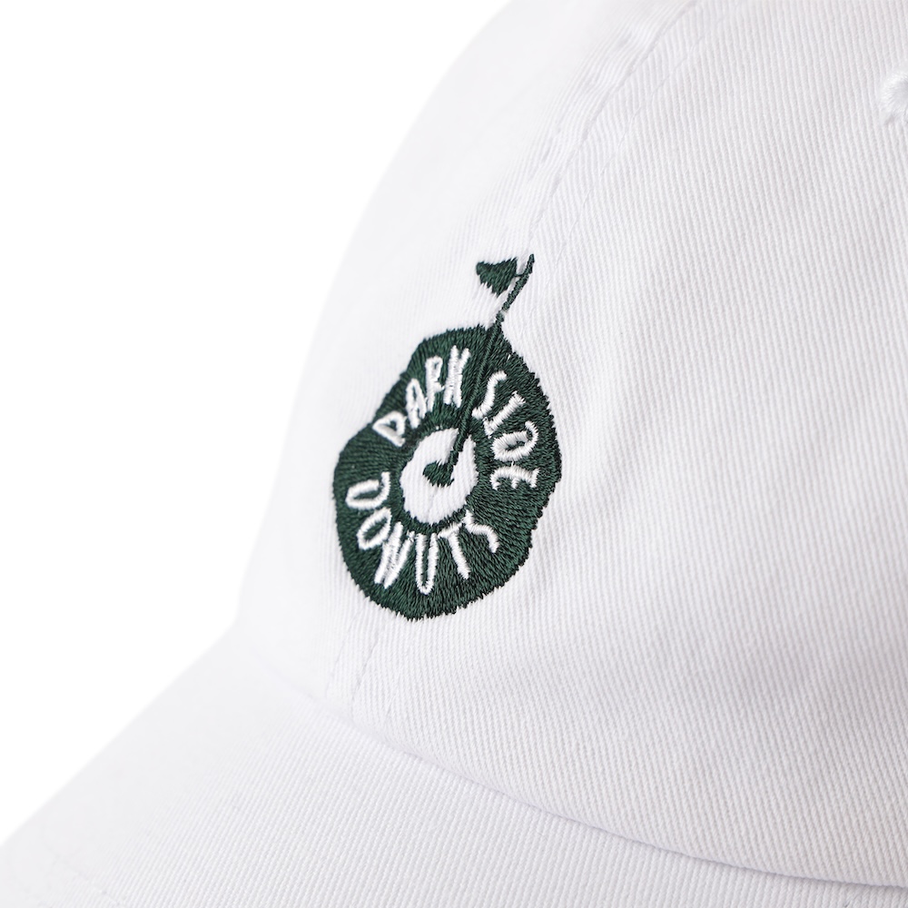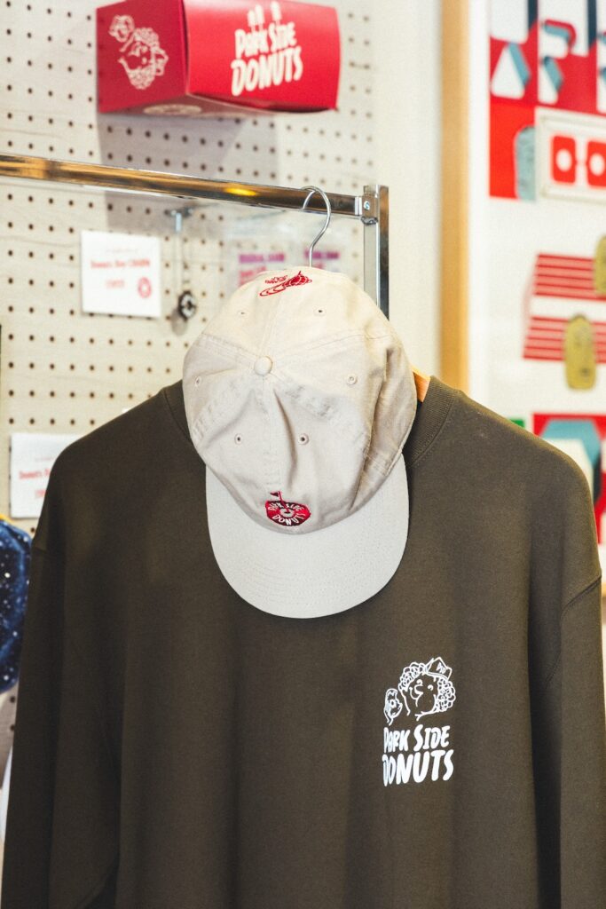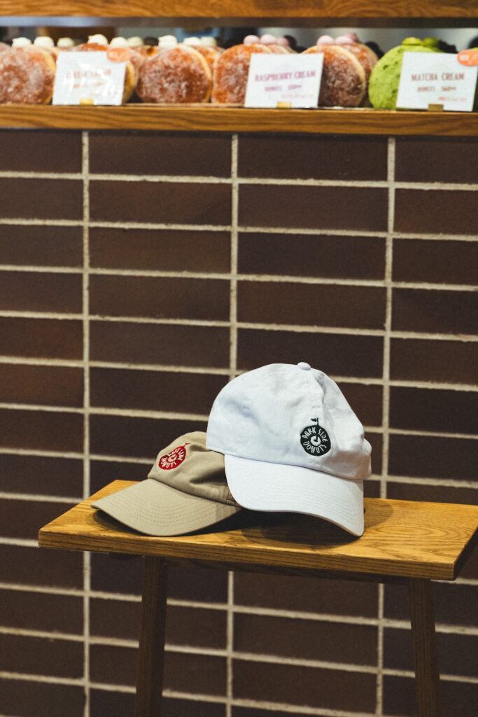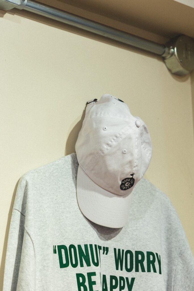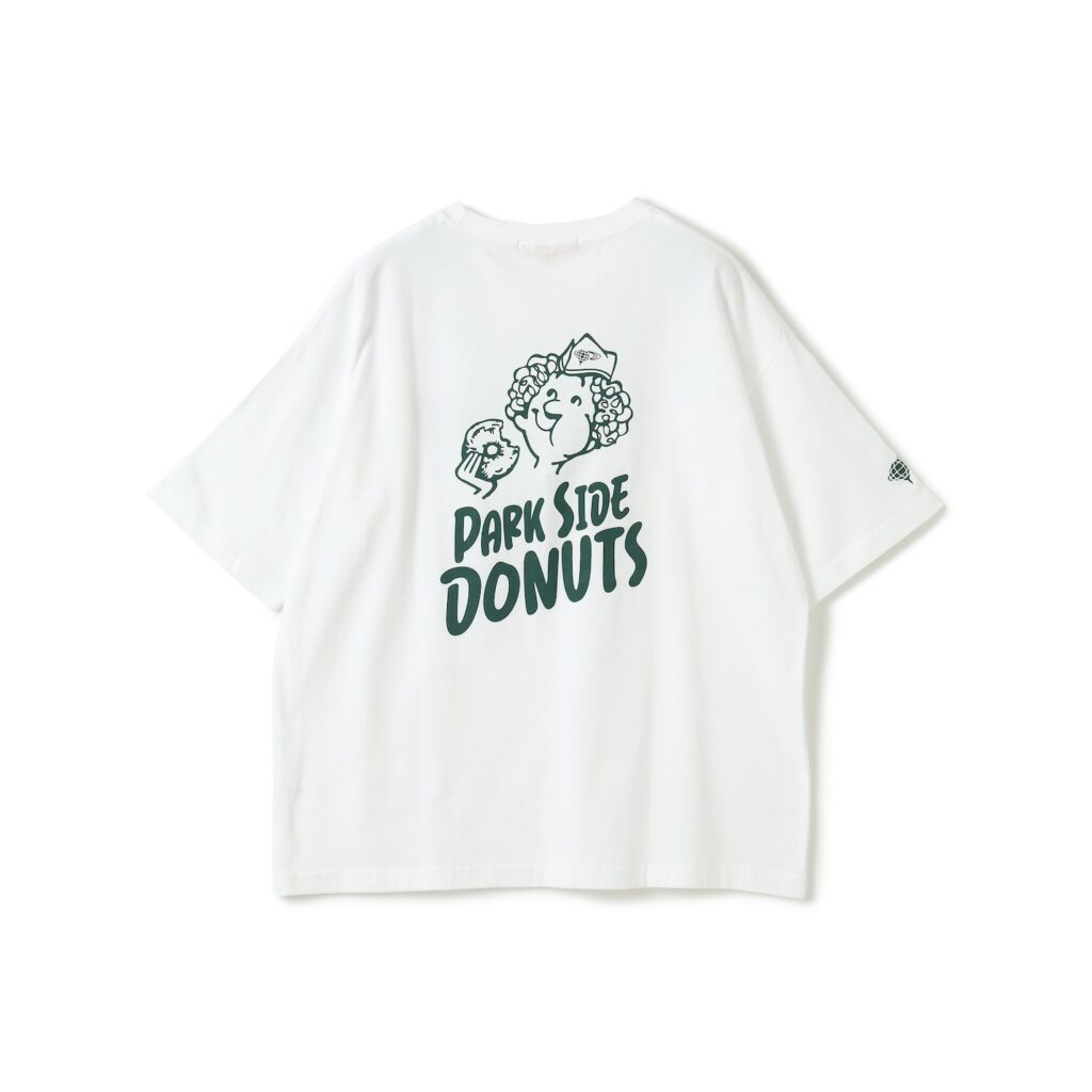 フロントセンターにドーナツロゴをグリーンに見立てたスペシャルロゴを刺繍。カラーはWHITE×GREENと「PARK SIDE DONUTS」のオフィシャルカラーBEIGE×DARK REDの2色展開。