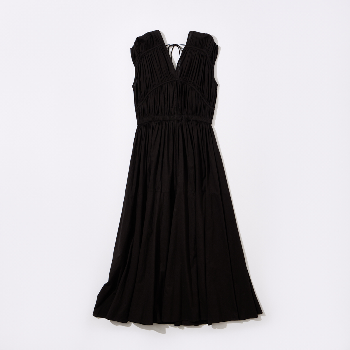 ウエストにゴムを入れているため、腰下から裾にかけてボリュームを出したふんわりと女性らしいシルエットのワンピース。バックの深めのVネックと共紐で結ぶリボンもポイントです。ワンピース¥39,600(エストネーション)