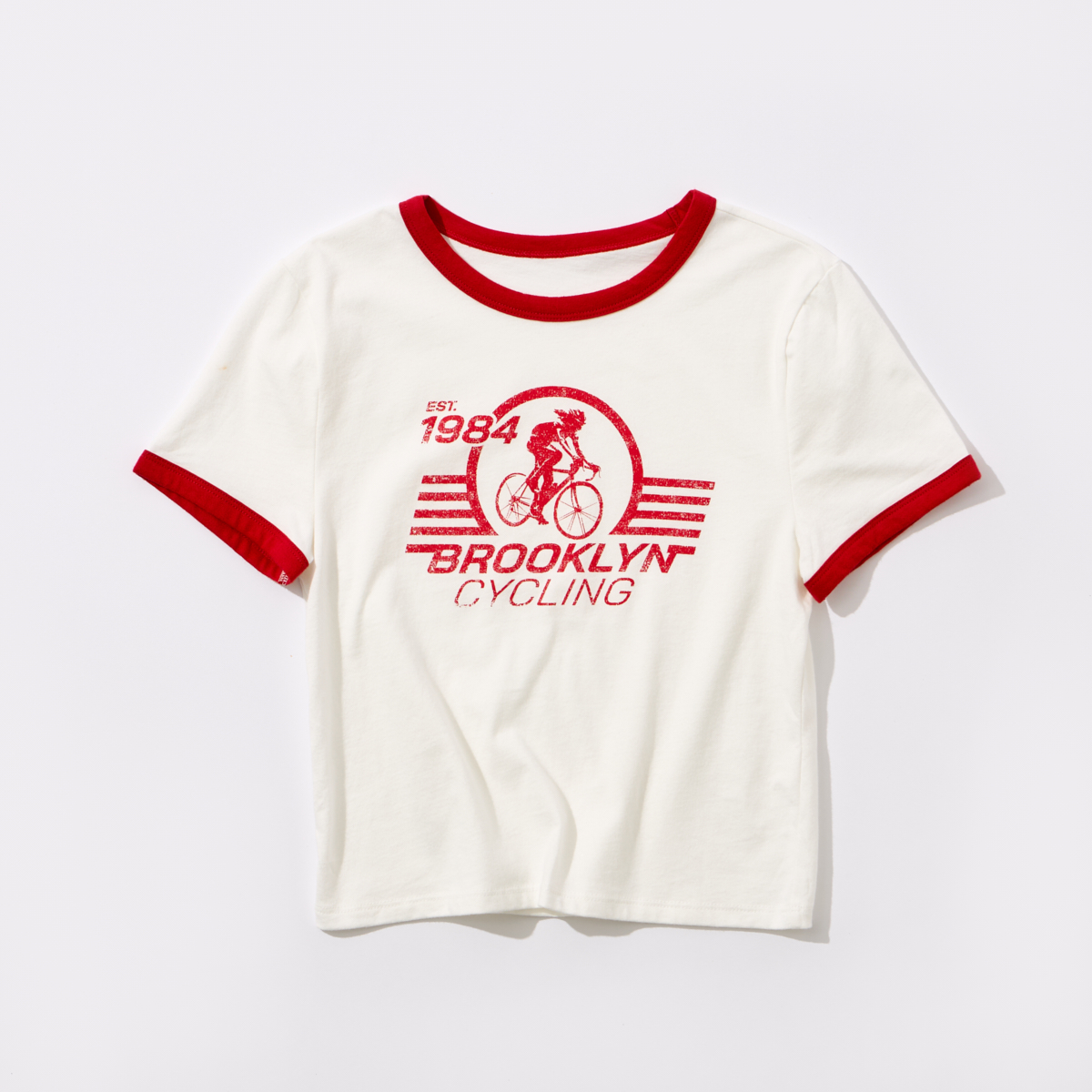 フロントに「Brooklyn Cycling (ブルックリン サイクリング)」とプリントされたヴィンテージ感のあるデザイン。クルーネックと袖口に施された赤いラインが可愛いアクセントに。キレイめスカートなどで大人っぽく着こなして。リンガーTシャツ¥3,990(Gap)