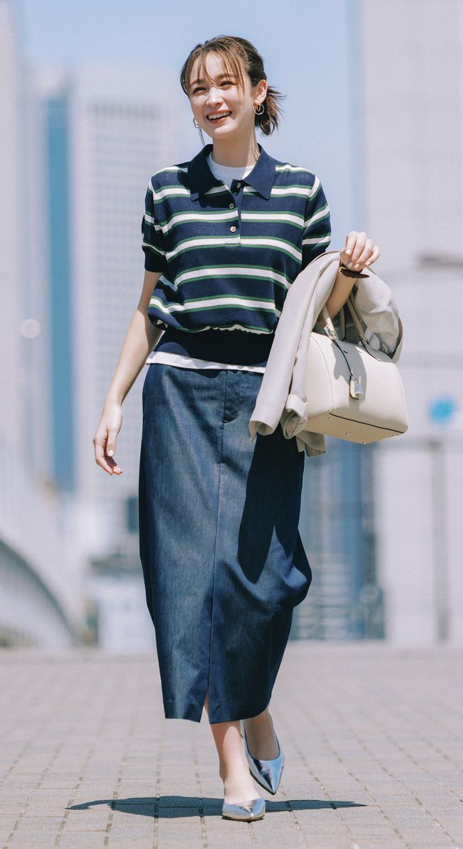紺地に白とグリーンが入った、トラッド感たっぷりのボーダー。襟付きなのできちんと感も備えています。程よくゆとりのあるシルエットでレイヤード使いにも◎。ポロニットはトラディショナル ウェザーウェア、Tシャツはスローン、スカートはサロン アダム エ ロペ、バッグはボナベンチュラ、靴はダイアナのもの。