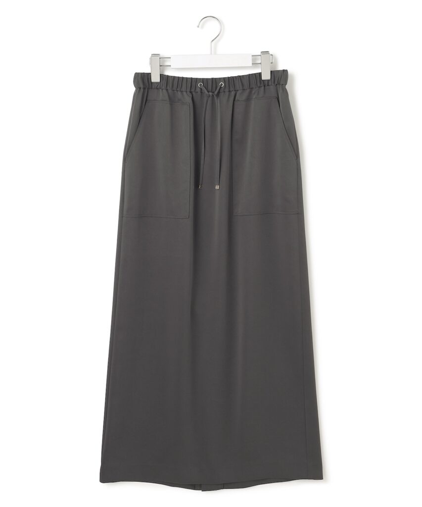 上品な光沢とワークディテールを融合した大人カジュアルなIラインスカート。ドロスト仕様でウエスト調整ができ、カットソーとも好相性な万能アイテム。撥水性とストレッチ性を兼ね備え、梅雨時期にも快適に着られる高機能素材を使用。