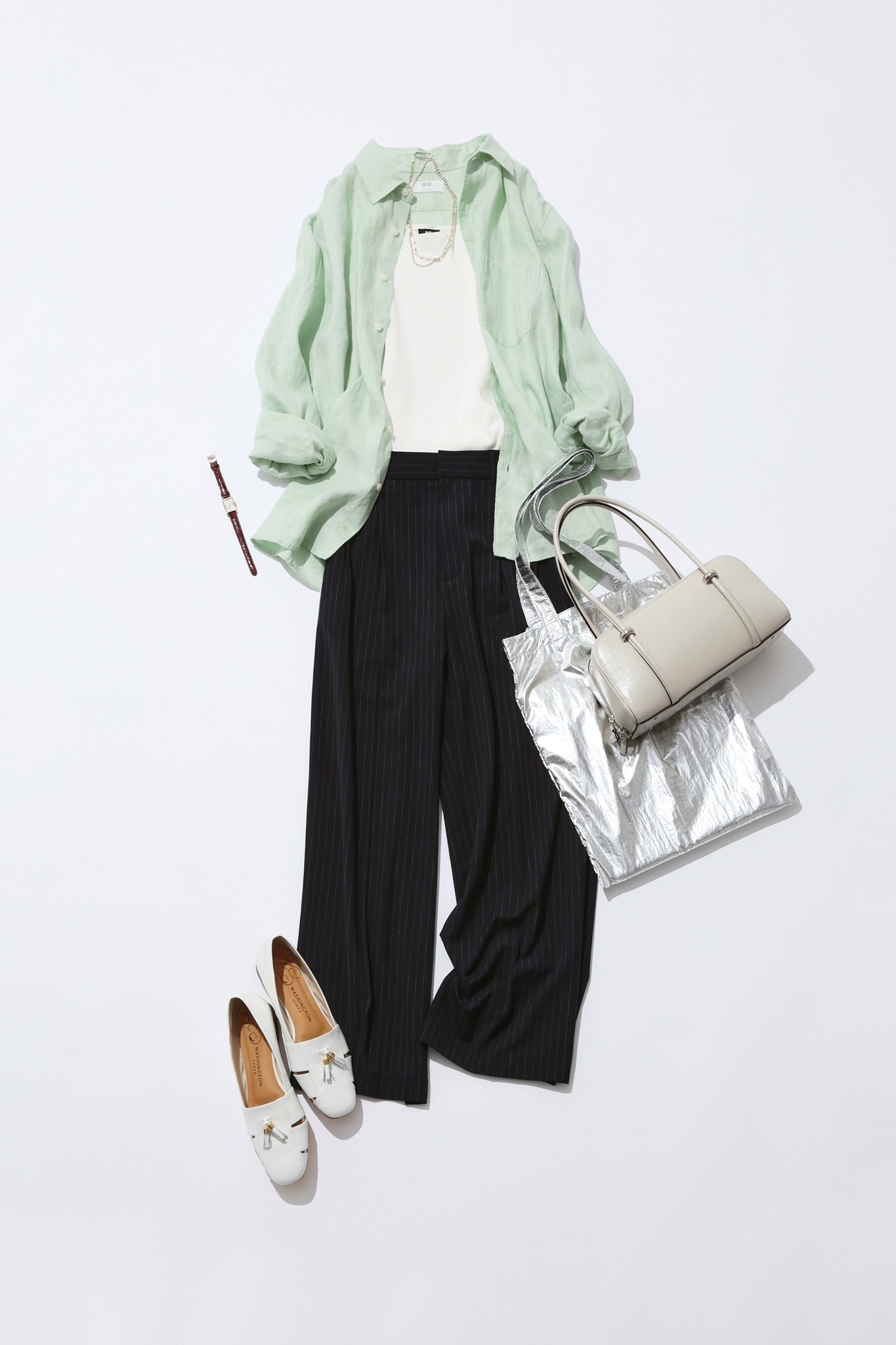 メンズのリネンシャツを羽織として活用!夏らしさと清潔感のあるミントグリーンがオフィスシーンにもぴったり。パンツのピンストライプもメンズっぽさを後押し。小物も爽やかな色味のホワイトやシルバーで揃えるのがおすすめです。